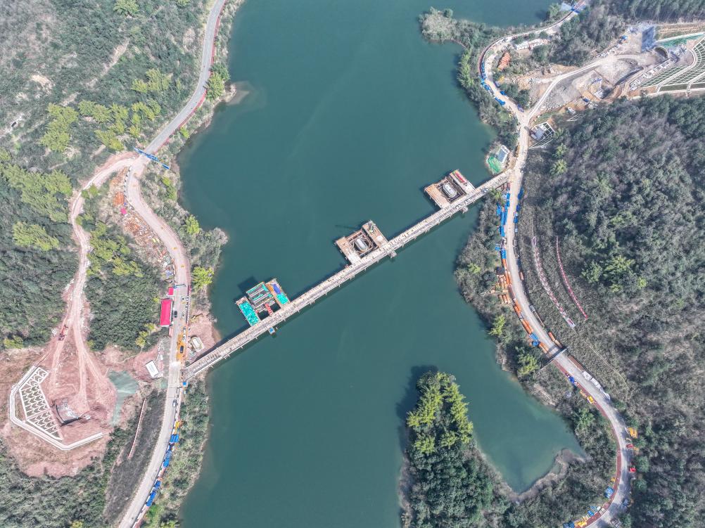 這是2月19日拍攝的位於(yu) 重慶市銅梁區的成渝中線高鐵玄天湖大橋建設現場(無人機照片)。新華社記者 唐奕 攝