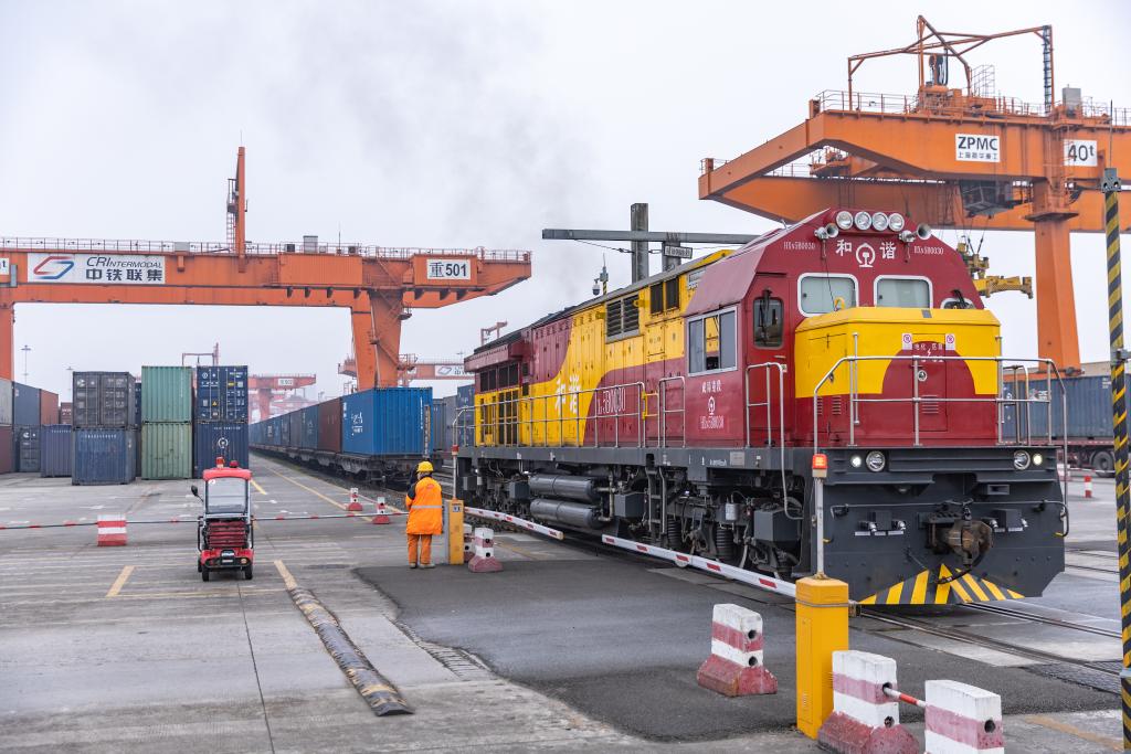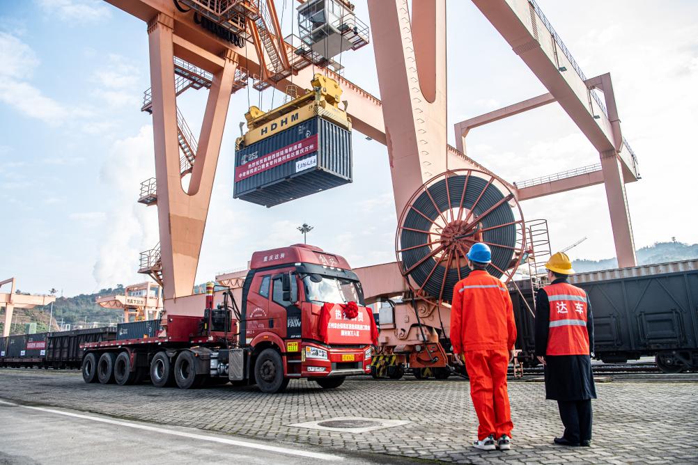 1月4日,在重慶萬(wan) 州新田港站,工作人員進行集裝箱吊裝作業(ye) ,將專(zhuan) 列貨物轉運至公路物流環節。 新華社記者 唐奕 攝
