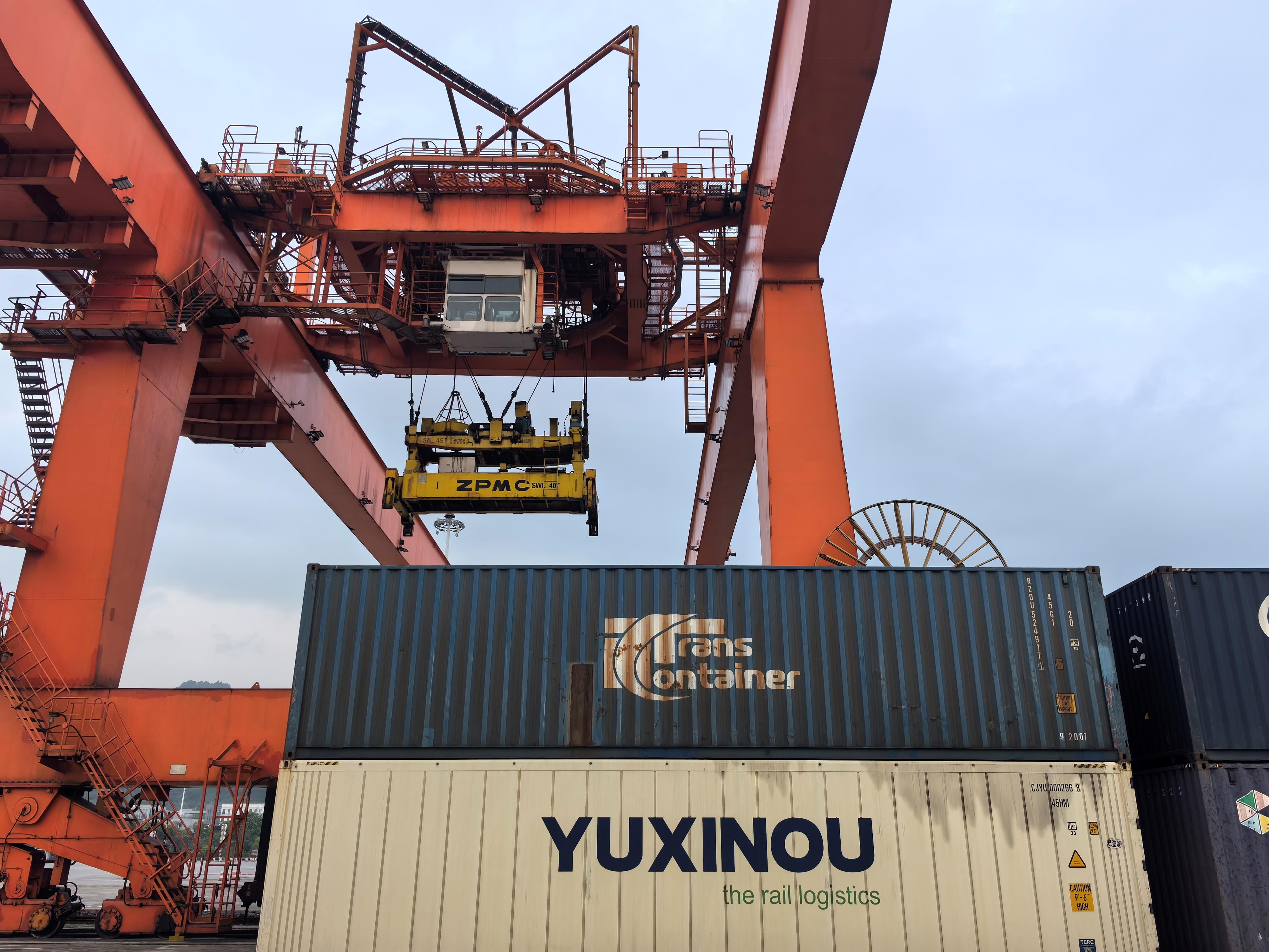 重慶國際物流樞紐園區內(nei) ,中歐班列運送的“渝新歐”集裝箱整齊排列。(總台央廣記者潘毅拍攝)