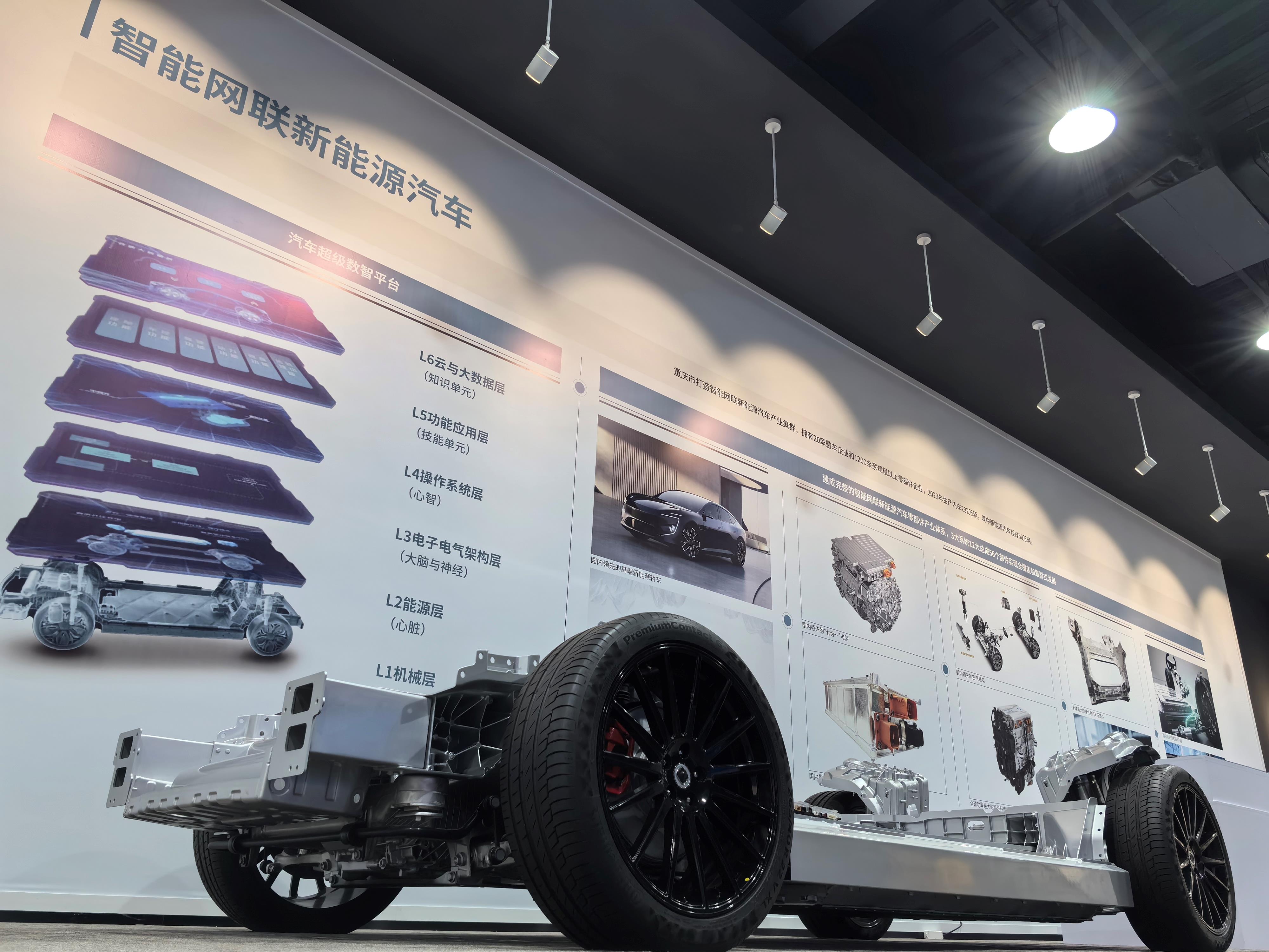 在重慶市科技創新和產(chan) 業(ye) 發展成果展示上的智能網聯新能源汽車部件。(總台央廣記者潘毅拍攝)