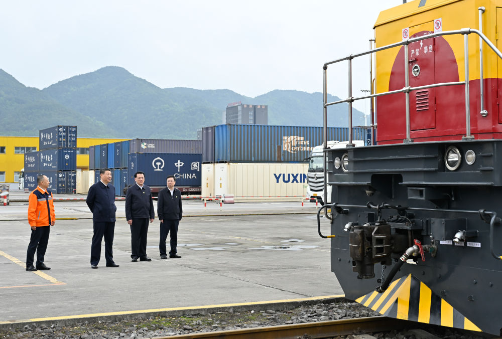 這是4月22日,習(xi) 近平在重慶國際物流樞紐園區,了解當地加快建設西部陸海新通道等情況。