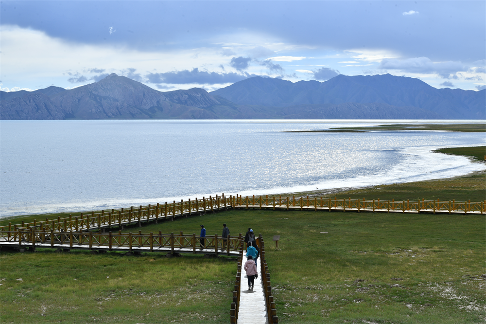 △ 遊客行走在青海瑪多縣冬格措納湖畔的木棧道上。