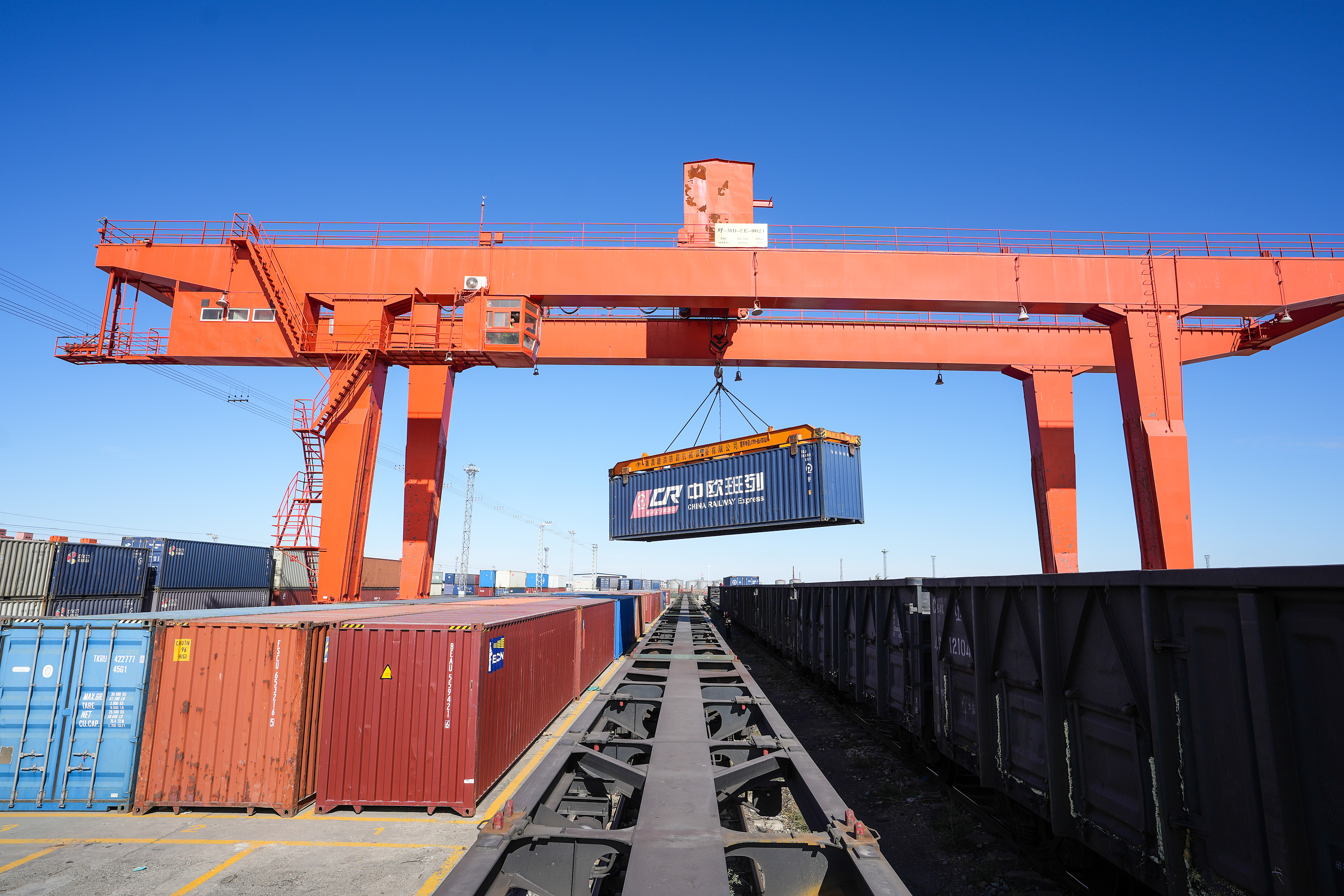 △ 內(nei) 蒙古錫林郭勒二連浩特口岸鐵路貨場內(nei) ,龍門吊正在吊裝中歐班列集裝箱。