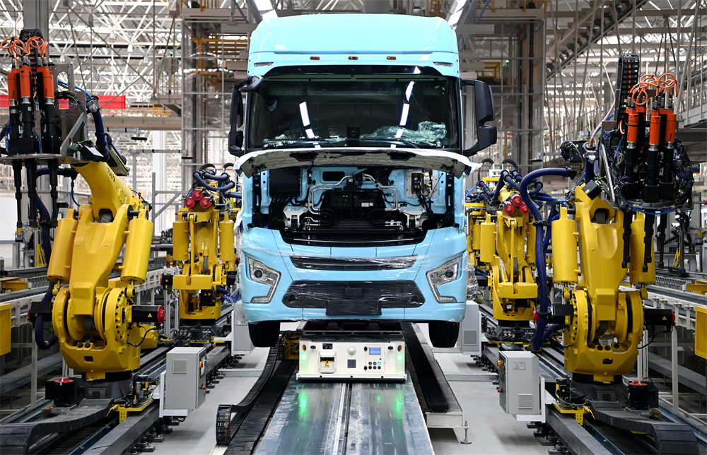 △ 一輛重卡在汽車總裝生產(chan) 線輪胎自動化裝配擰緊無人工作站進行裝配。