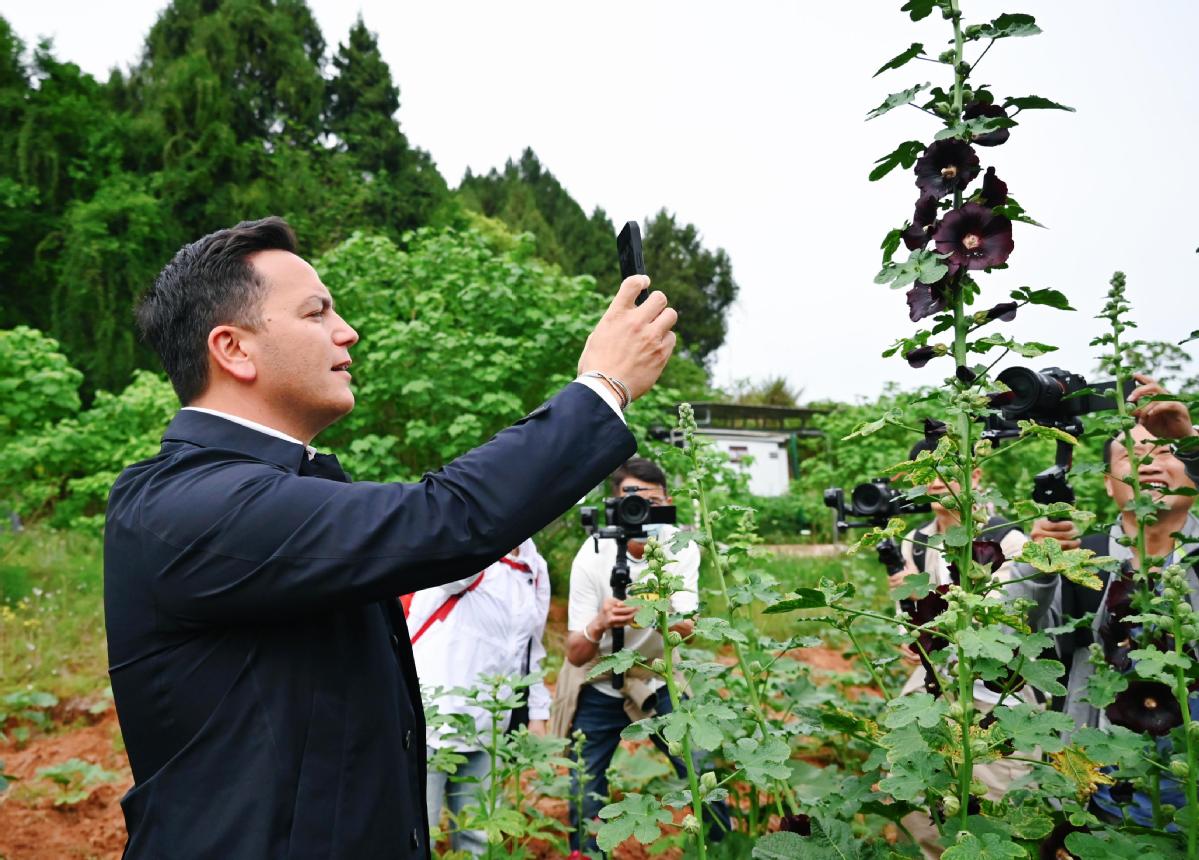 2024年4月23日,國際園藝生產(chan) 者協會(hui) 主席萊昂納多·卡皮塔尼奧在成都市金堂縣鮮花山穀景區考察蜀葵產(chan) 業(ye) 。