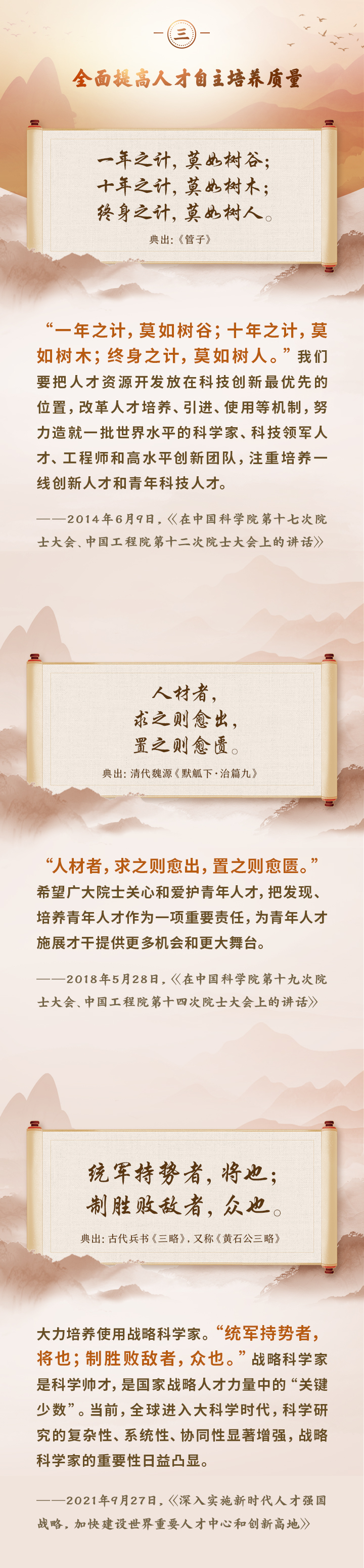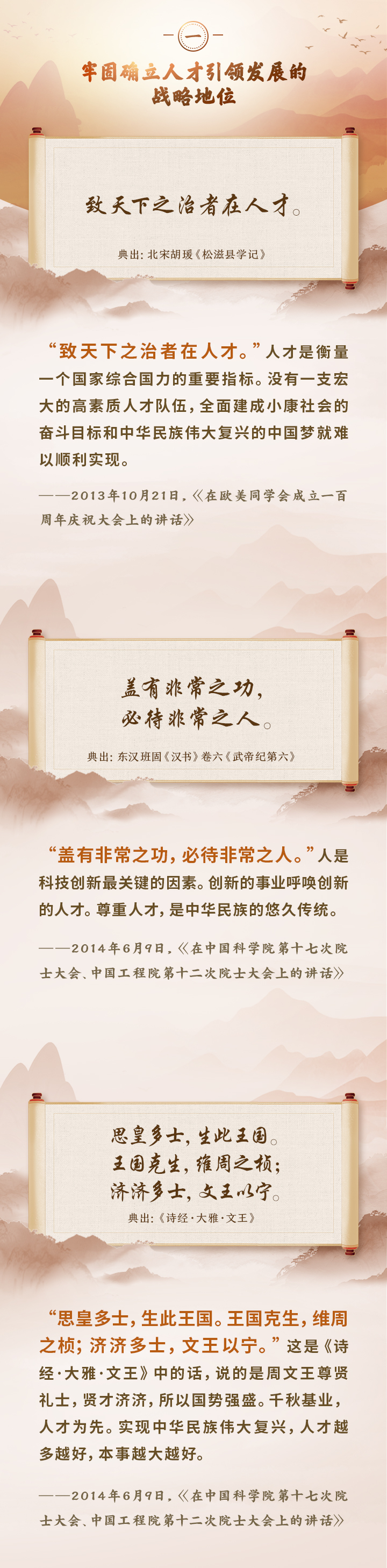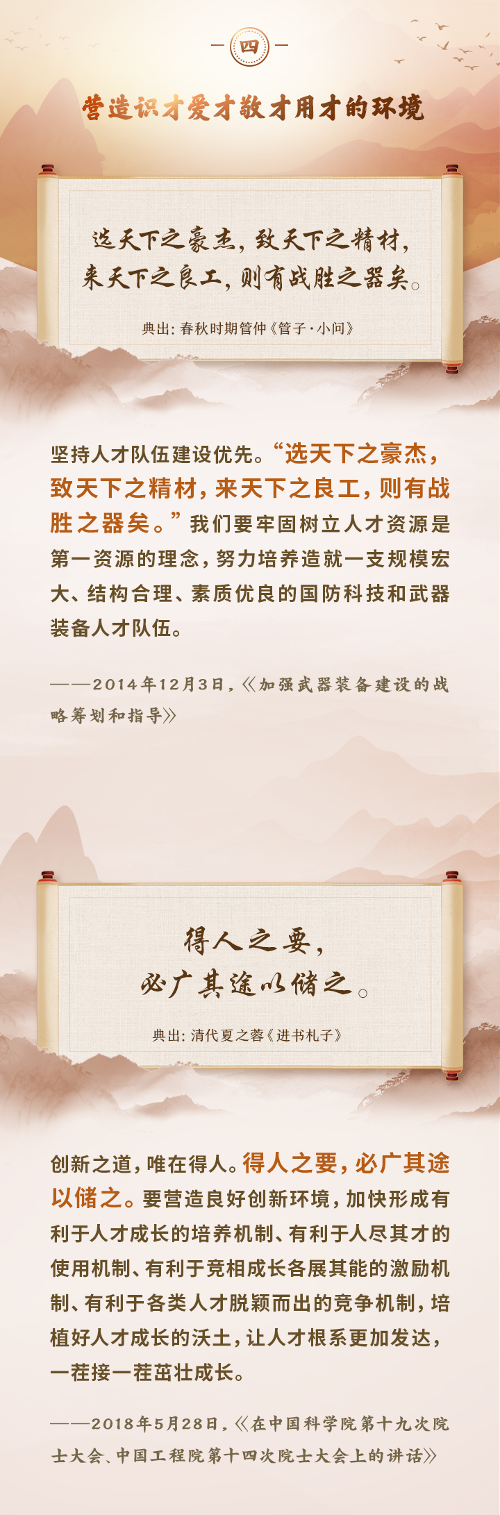編者按:培養(yang) 造就大批德才兼備的高素質人才,是國家和民族長遠發展大計。黨(dang) 的十八大以來,習(xi) 近平總書(shu) 記圍繞人才工作發表一係列重要論述,立意高遠,內(nei) 涵豐(feng) 富,思想深刻,深刻回答了為(wei) 什麽(me) 建設人才強國、什麽(me) 是人才強國、怎樣建設人才強國的重大理論和實踐問題。在這些重要論述中,總書(shu) 記精妙運用古代典籍、經典名句,以古喻今、啟迪思想、激蕩精神,讓我們(men) 一起來學習(xi) !