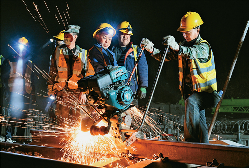 2024年4月10日,在內(nei) 蒙古包頭市,包銀高鐵引入包頭樞紐工程的關(guan) 鍵控製性工程之一——包西上行線路撥接完成施工。此次施工完成,標誌著包銀高鐵引入包頭樞紐包頭站改造工程取得重大進展,為(wei) 包銀高鐵開通奠定堅實基礎。圖為(wei) 4月10日淩晨,工人在包西上行線路上作業(ye) 。 新華社記者 劉磊/攝