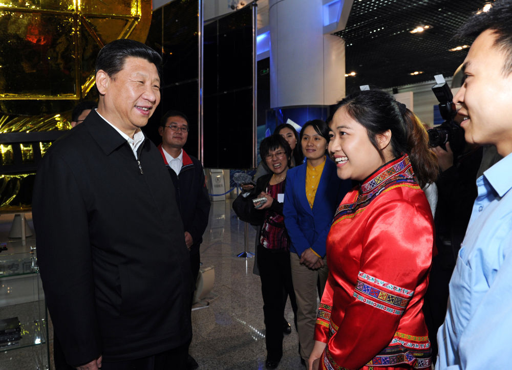 2013年5月4日,習(xi) 近平來到中國航天科技集團公司中國空間技術研究院,同各界優(you) 秀青年代表座談並發表重要講話。這是座談會(hui) 前,習(xi) 近平和在展廳參觀的優(you) 秀青年代表交談。