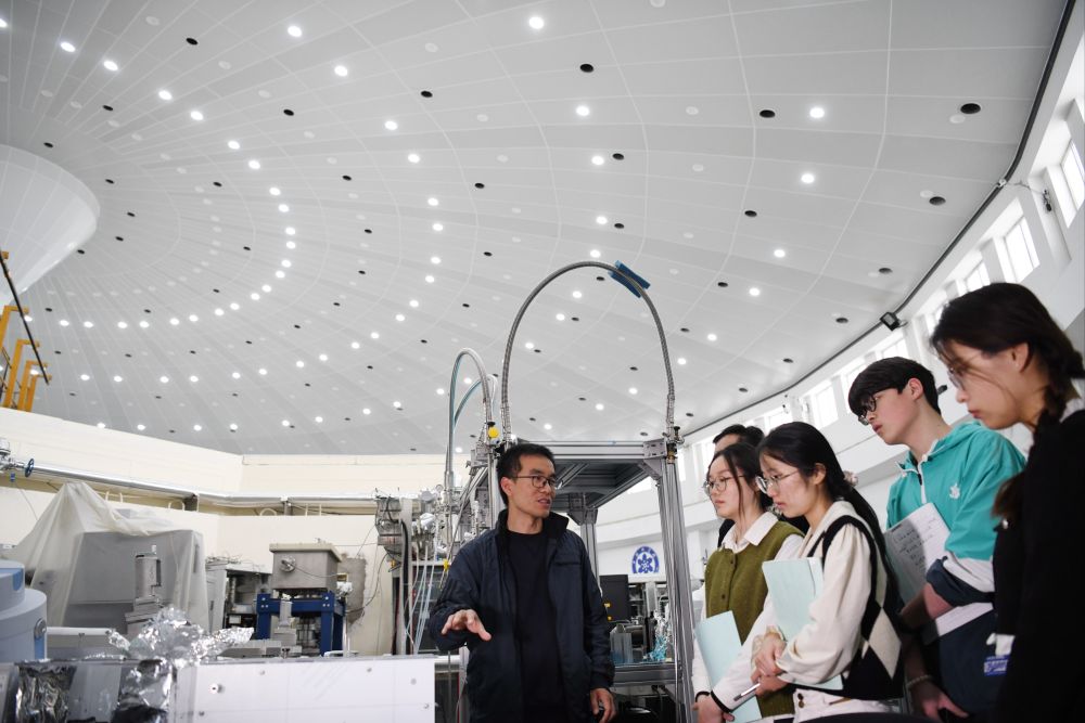 在中國科學技術大學國家同步輻射實驗室,安徽省先進功能高分子薄膜工程實驗室團隊成員崔昆朋教授(左一)同學生交流(2024年4月6日攝)。新華社記者 張端 攝