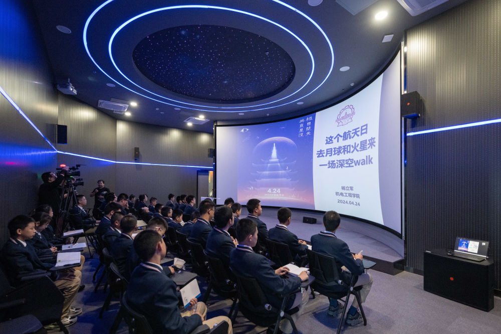 學生在哈爾濱工業(ye) 大學航天館內(nei) 聽中國航天日主題講座(2024年4月24日攝)。新華社記者 謝劍飛 攝
