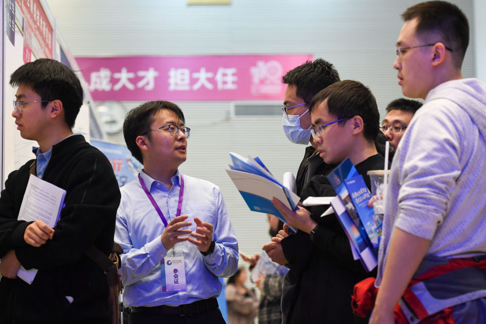 在清華大學舉(ju) 辦的2024屆畢業(ye) 生大型就業(ye) 洽談會(hui) 上,一名用人單位招聘人員(左二)與(yu) 求職畢業(ye) 生交流(2024年3月15日攝)。新華社記者 鞠煥宗 攝