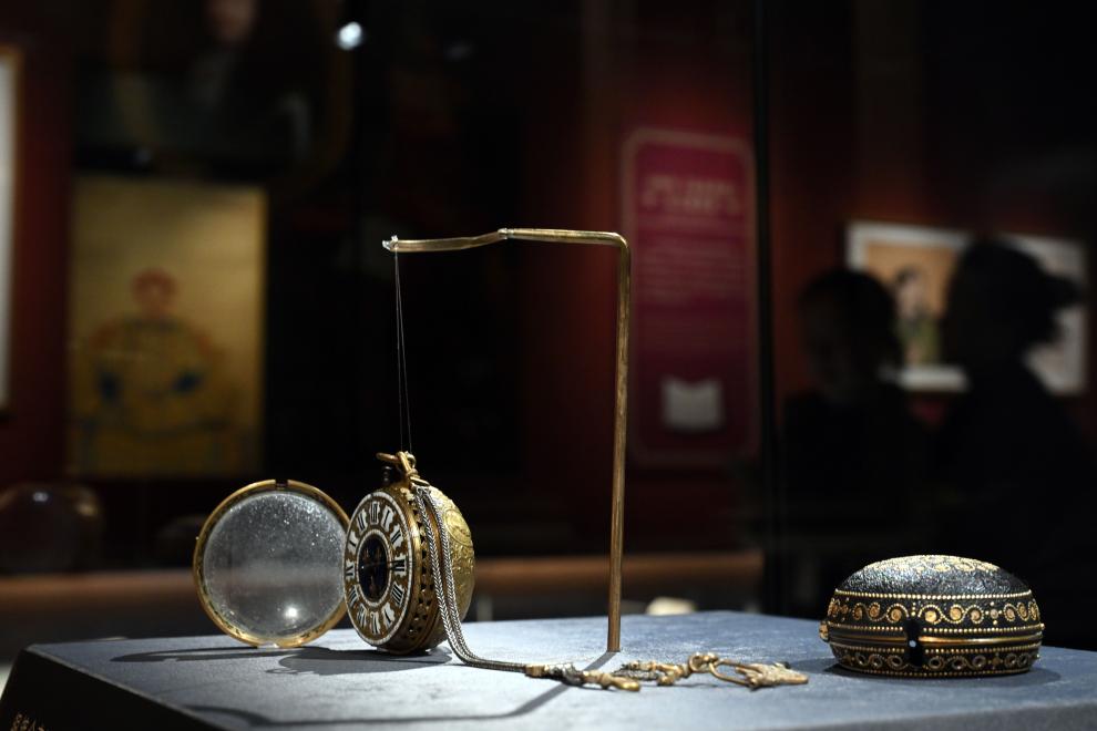 這是展出的故宮博物院藏銅鍍金殼開光人物像懷表。2024年4月1日,作為(wei) 中法文化旅遊年的重要項目,“紫禁城與(yu) 凡爾賽宮——17、18世紀的中法交往”展覽開幕式在北京故宮文華殿舉(ju) 行,展出大約200件文物精品。(新華社記者金良快攝)