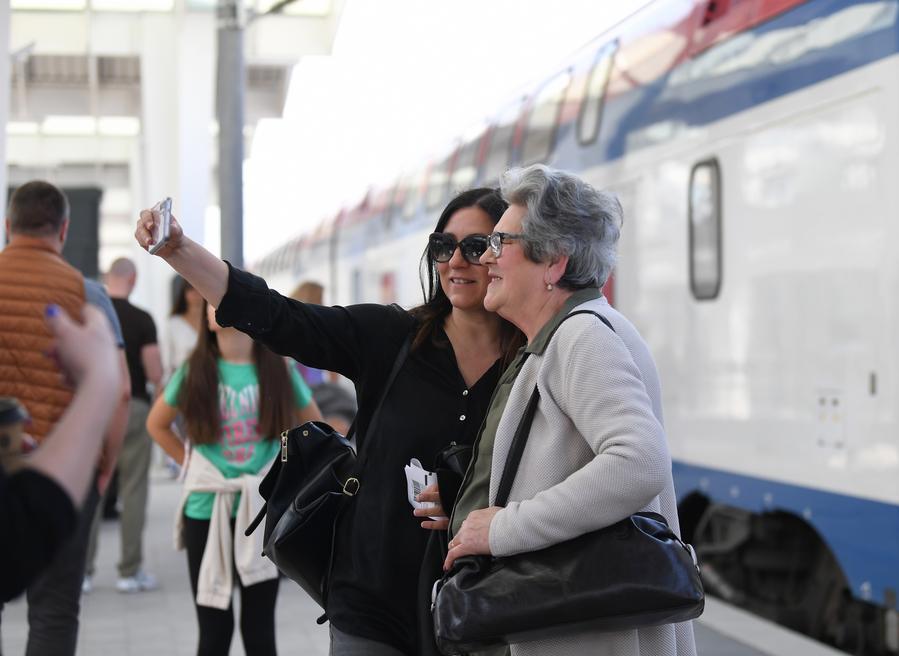 2023年5月6日,在塞爾維亞(ya) 諾維薩德火車站,乘客在開往貝爾格萊德的列車前自拍。新華社記者任鵬飛攝