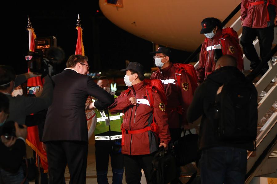 中國醫療團隊在貝爾格萊德尼古拉·特斯拉機場降落時已是深夜。武契奇率領塞方多名高級官員到機場迎接。疫情期間不建議握手,於(yu) 是這位塞爾維亞(ya) 領導人選擇和中國專(zhuan) 家團成員一一碰肘以示尊重。對中國的及時支援心懷感激,他還在機場親(qin) 吻了一麵五星紅旗。