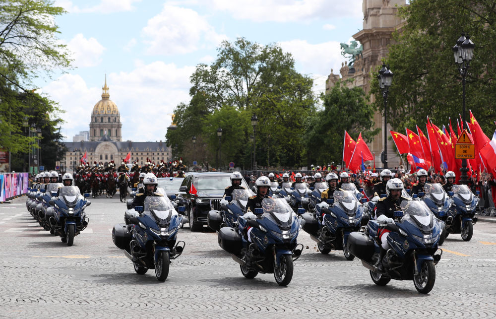 歡迎儀(yi) 式後,習(xi) 近平和彭麗(li) 媛在共和國衛隊148名騎兵組成的禮兵馬隊和摩托車隊護衛下,乘車前往愛麗(li) 舍宮。