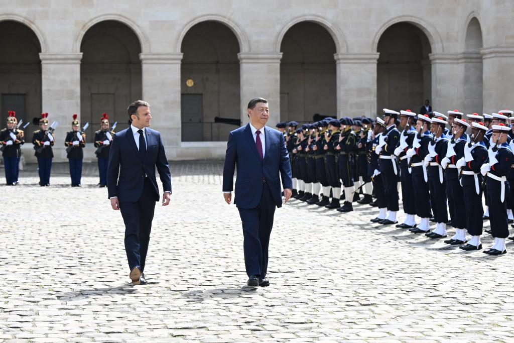 當天下午,習(xi) 近平在巴黎出席馬克龍舉(ju) 行的隆重盛大歡迎儀(yi) 式。兩(liang) 國元首檢閱法蘭(lan) 西共和國衛隊和陸海空三軍(jun) 儀(yi) 仗隊,並觀看分列式。
