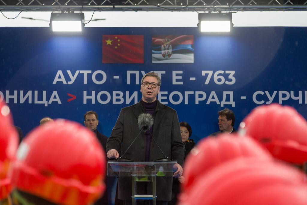 2023年4月1日,塞爾維亞(ya) 總統武契奇在首都貝爾格萊德的塞爾維亞(ya) E763高速公路新貝爾格萊德-蘇爾欽段通車儀(yi) 式上致辭。新華社記者石中玉攝