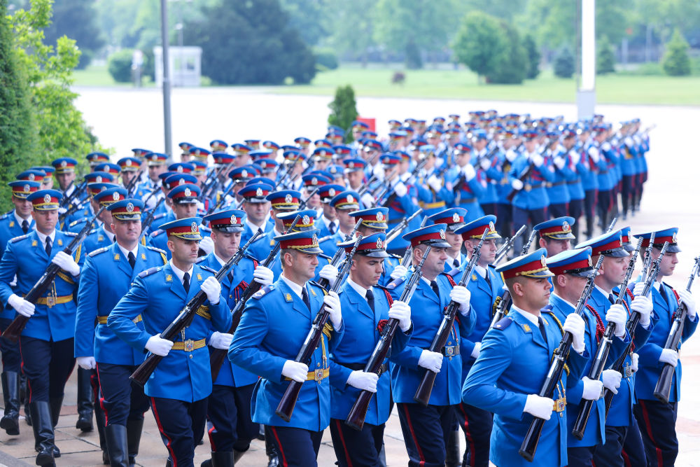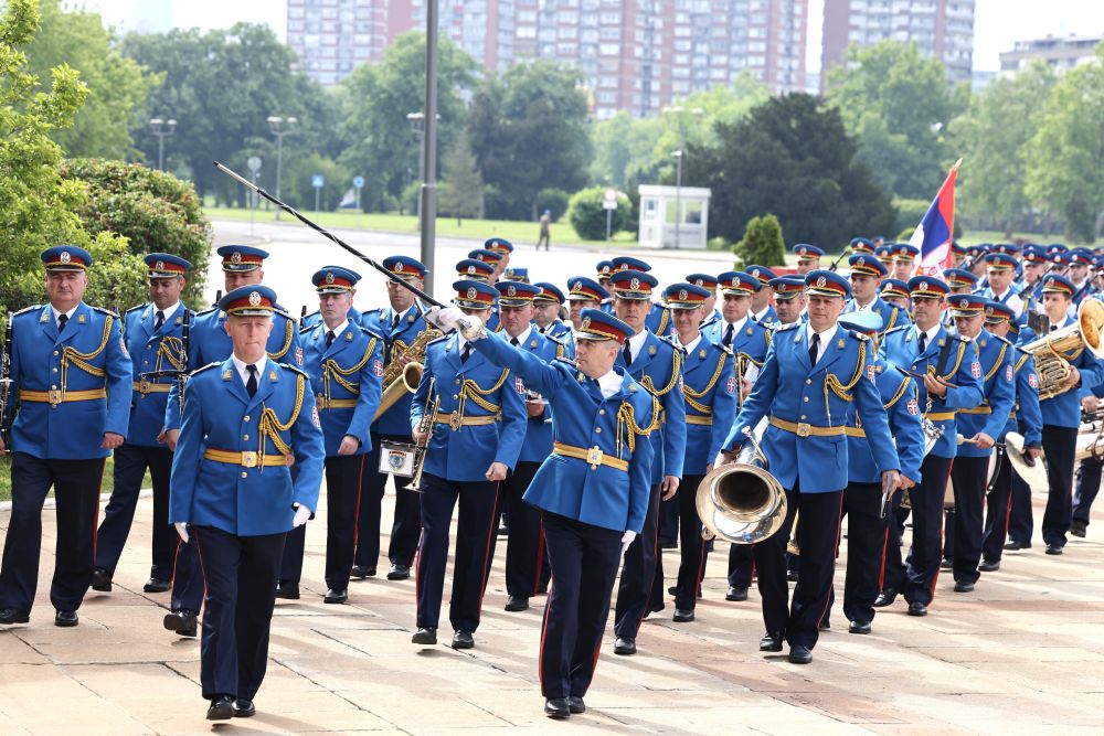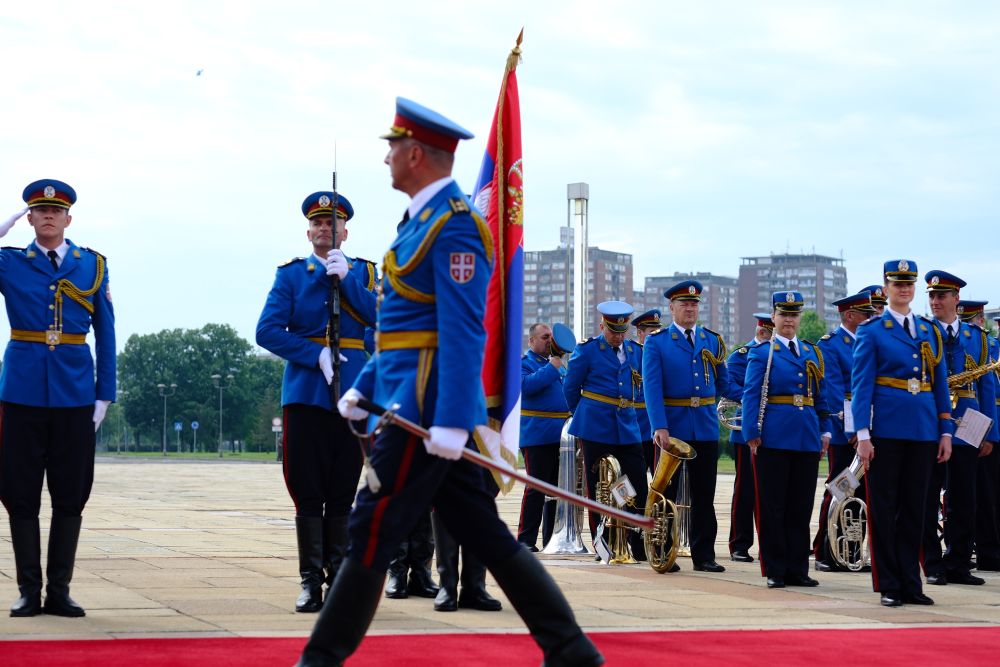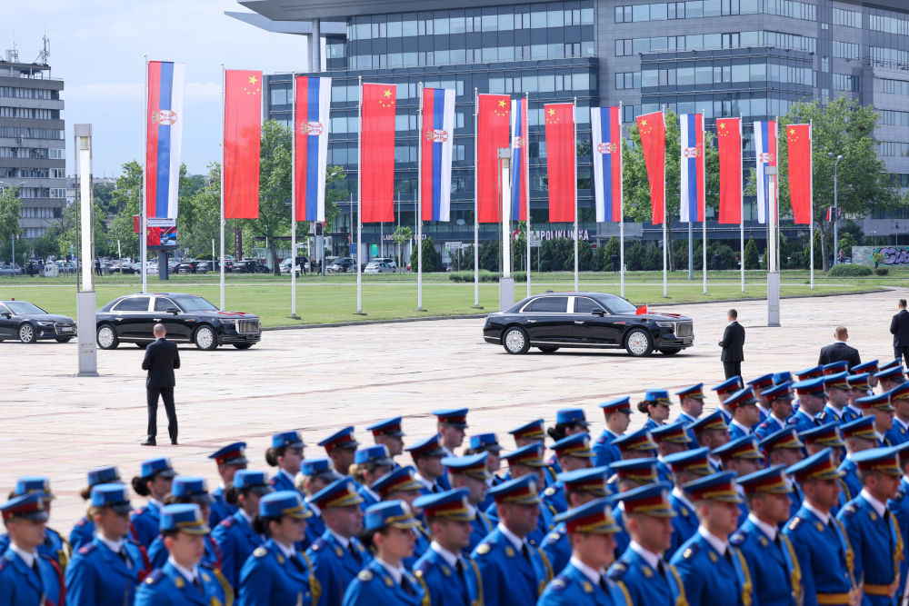 塞爾維亞(ya) 大廈前,中塞兩(liang) 國國旗迎風飄揚,儀(yi) 仗隊威武雄壯。