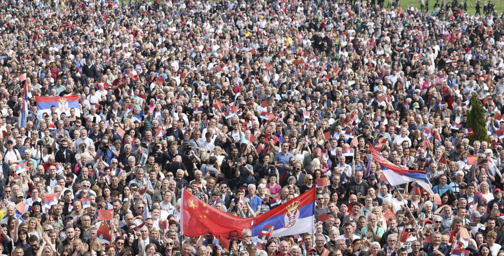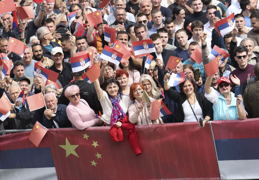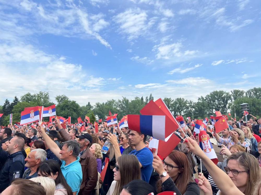 大廈廣場上,一萬(wan) 五千名塞爾維亞(ya) 民眾(zhong) 揮舞中塞兩(liang) 國國旗,對習(xi) 近平表示最熱烈的歡迎。