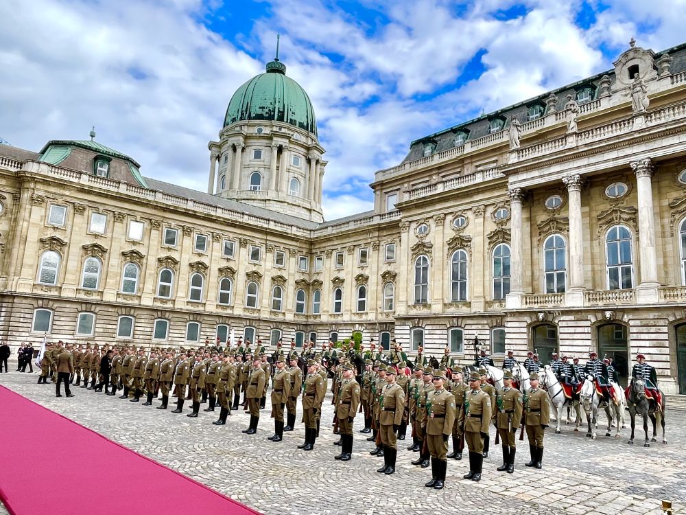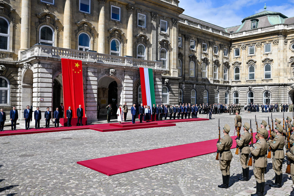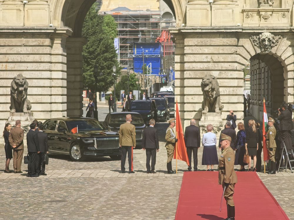 初夏時節的布達佩斯陽光明媚,古老宏偉(wei) 的布達王宮莊嚴(yan) 矗立,中匈兩(liang) 國國旗相映成輝。習(xi) 近平和夫人彭麗(li) 媛乘坐的國賓車隊在匈牙利禮賓馬隊護衛下緩緩駛入布達王宮內(nei) 庭。舒尤克總統夫婦和歐爾班總理夫婦熱情迎接。