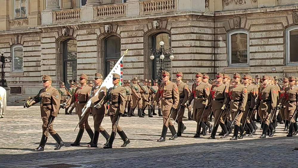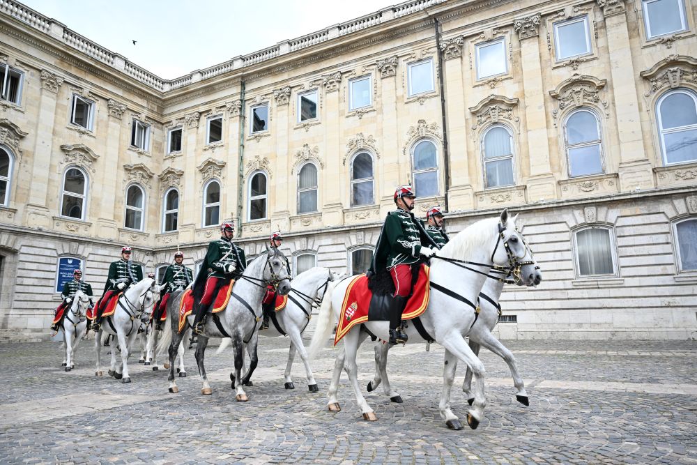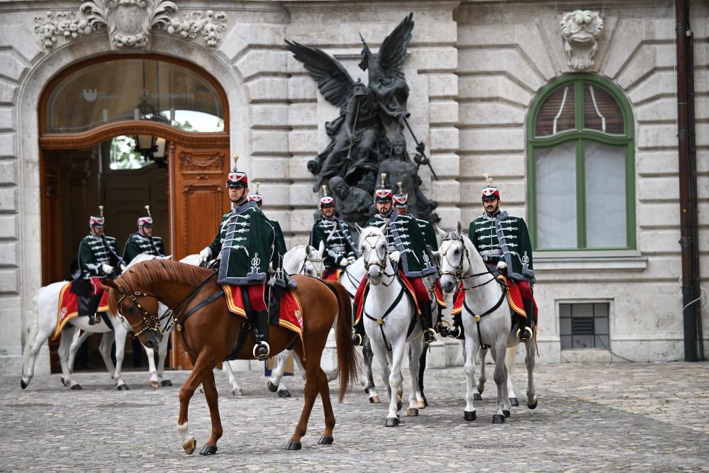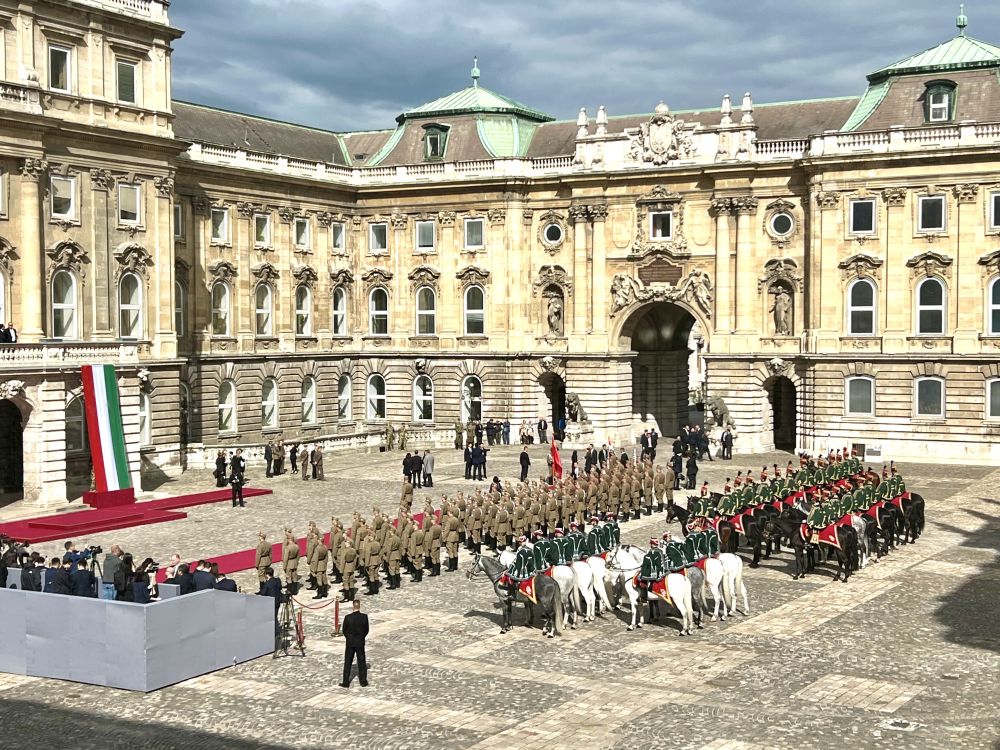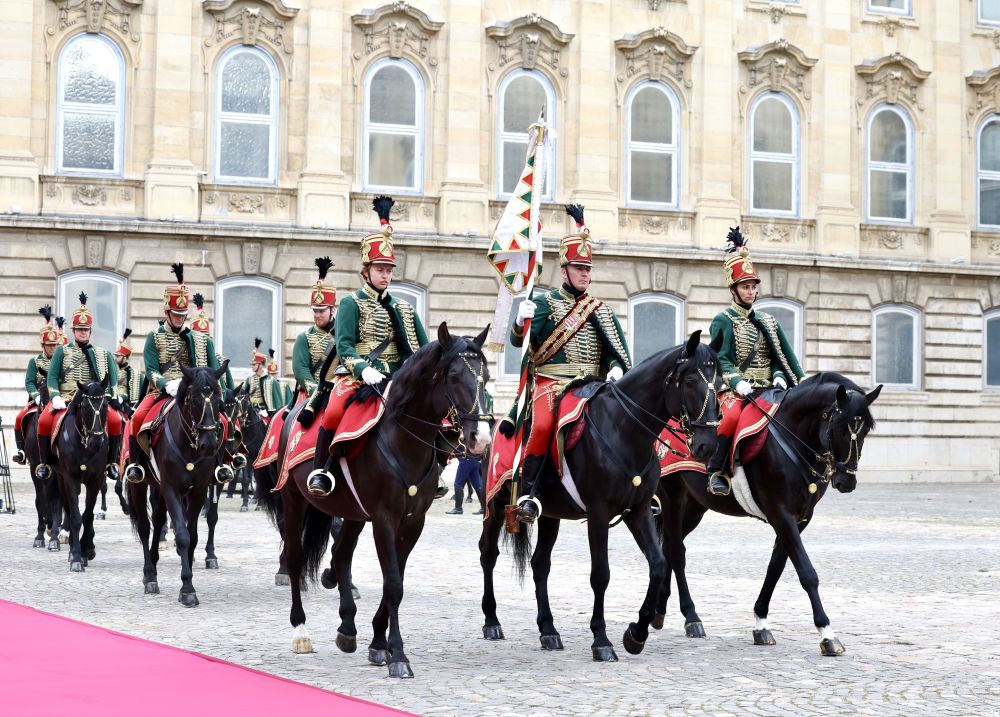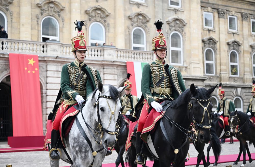 當地時間5月9日上午,國家主席習(xi) 近平在布達佩斯出席匈牙利總統舒尤克和總理歐爾班共同舉(ju) 行的隆重歡迎儀(yi) 式。習(xi) 近平在舒尤克陪同下檢閱國防軍(jun) 儀(yi) 仗隊和騎兵儀(yi) 仗隊。