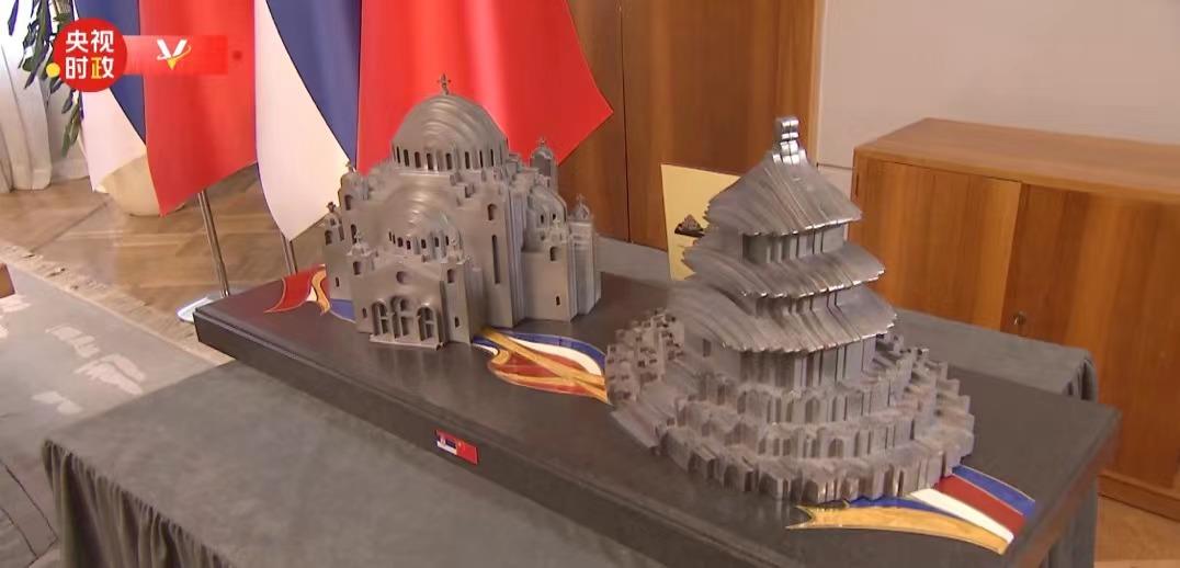 這份禮物是北京天壇和貝爾格萊德聖薩瓦教堂造型的鋼製工藝品,由中國河鋼集團斯梅戴雷沃鋼廠生產(chan) 的鋼材製成。望著這份禮物,習(xi) 主席風趣地說,是“鋼杆”朋友了。