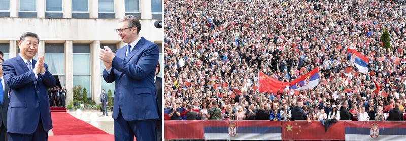 當地時間5月8日上午,雙方會(hui) 談前,武契奇總統陪同習(xi) 近平主席來到塞爾維亞(ya) 大廈平台。大廈廣場上,一萬(wan) 五千名塞爾維亞(ya) 民眾(zhong) 揮舞中塞兩(liang) 國國旗,對習(xi) 近平主席表示最熱烈的歡迎(右圖)。