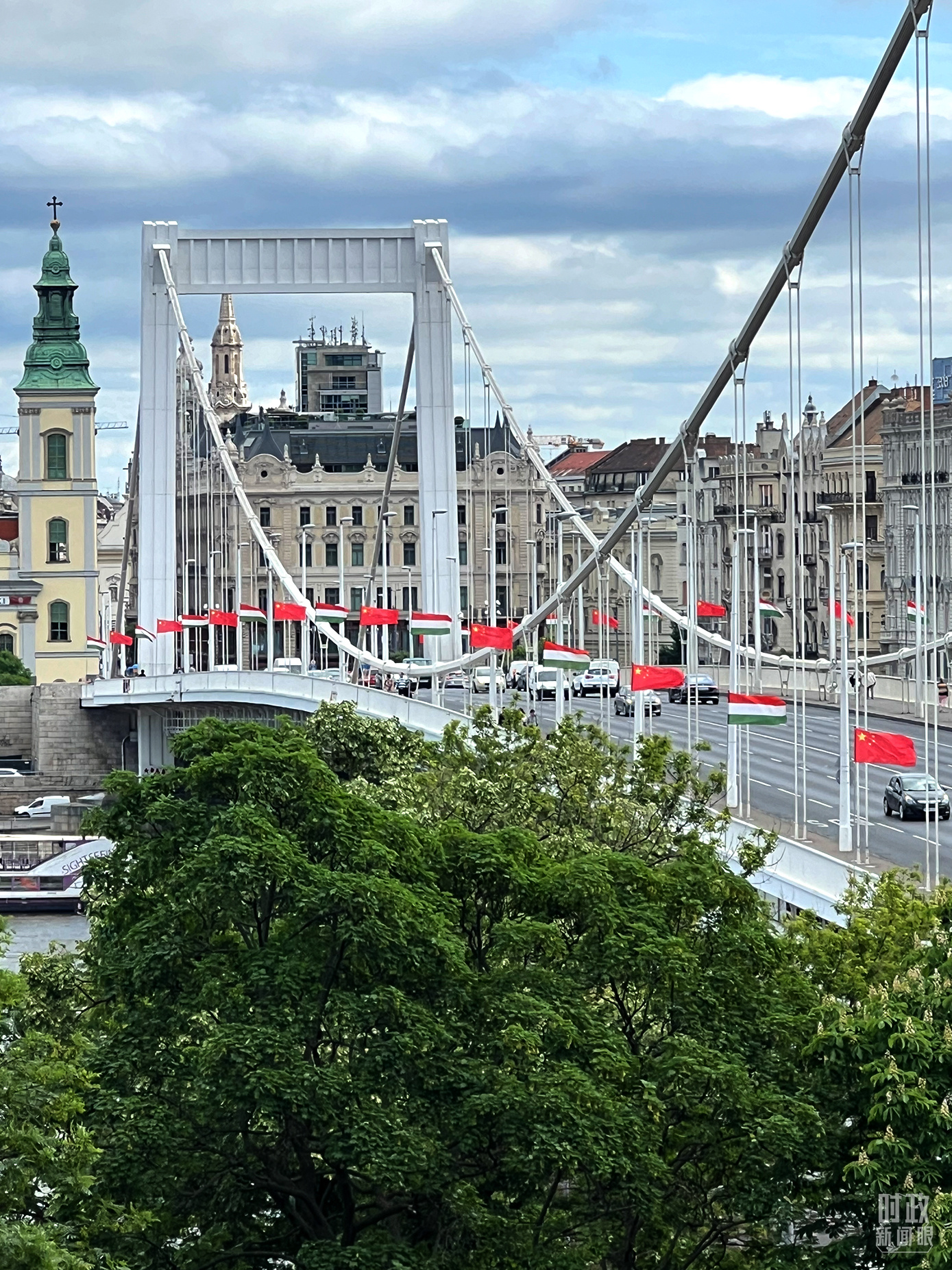 懸掛中匈兩(liang) 國國旗的布達佩斯伊麗(li) 莎白大橋。(總台央視記者石偉(wei) 明拍攝)