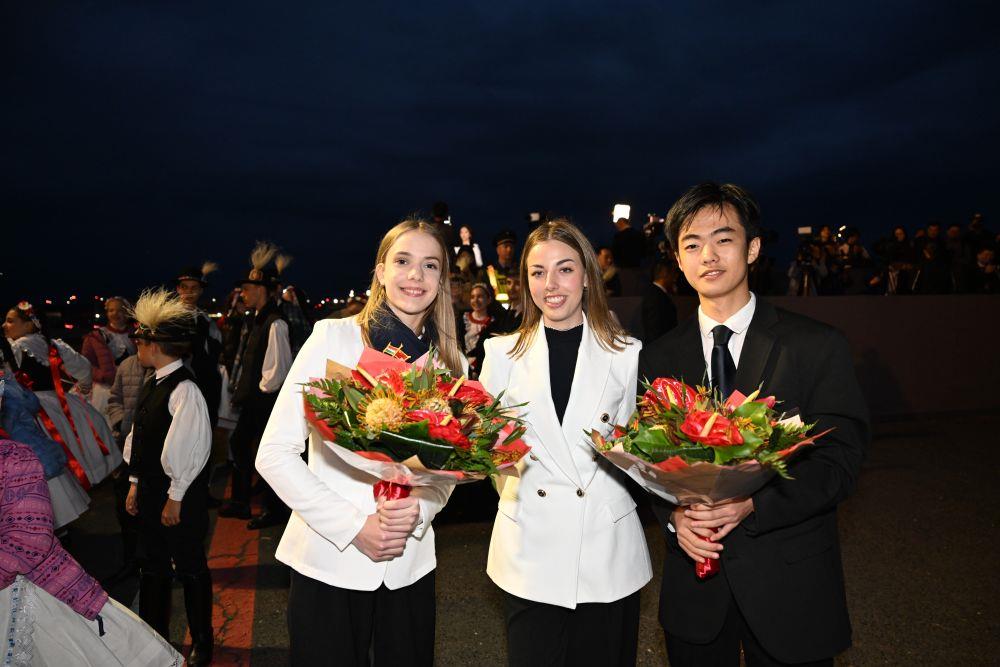 當地時間5月8日晚,在匈牙利布達佩斯國際機場,匈牙利姑娘歐拉·塔瑪拉(中)與(yu) 匈中雙語學校兩(liang) 名參加歡迎儀(yi) 式的學生合影。