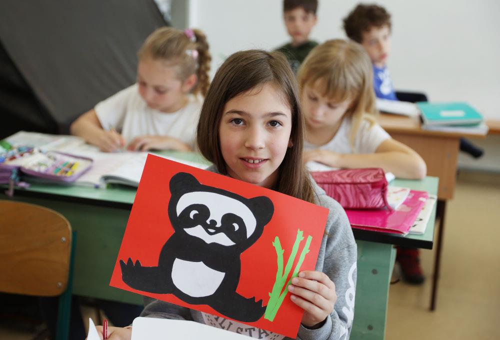 2024年5月3日,匈中雙語學校三年級學生寶怡展示自己的大熊貓形象美術作品。
