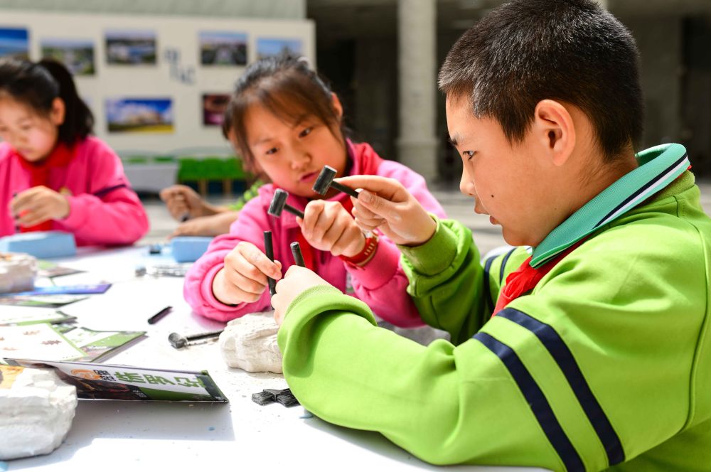 2024年4月22日,內(nei) 蒙古自治區鄂爾多斯市康巴什區實驗小學在康巴什自然博物館開展“探索自然奧秘 保護地球家園”主題研學活動,這是學生在研學課程中體(ti) 驗尋找動物化石。