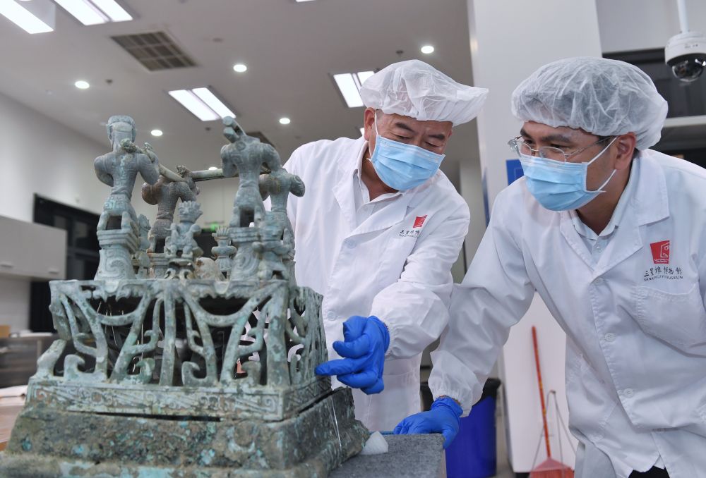 2023年5月30日,在四川三星堆博物館文物保護和修複中心,三星堆博物館陳列保管部副部長郭漢中(左)與(yu) 同事討論神壇底座修複方案。