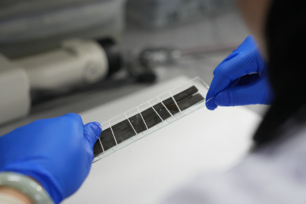 2024年3月4日,工作人員在湖南省文物考古研究院長沙銅官窯基地封護簡牘。