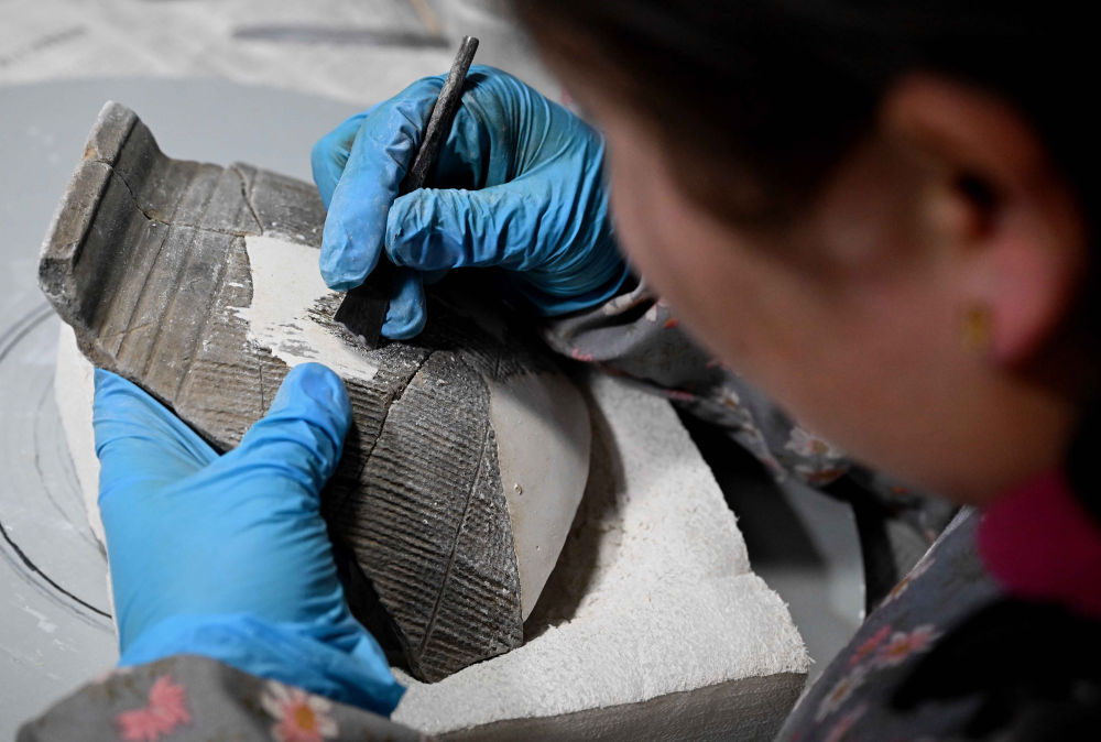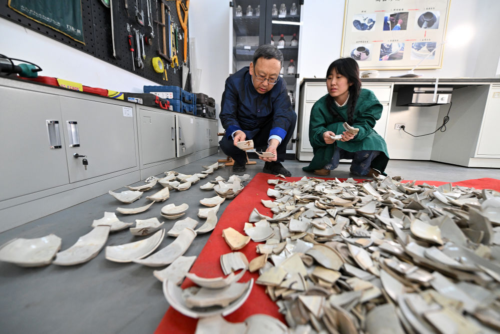 2024年2月23日,在中國社會(hui) 科學院考古研究所安陽工作站,工作人員在整理修複殷墟洹北商城出土的陶片。