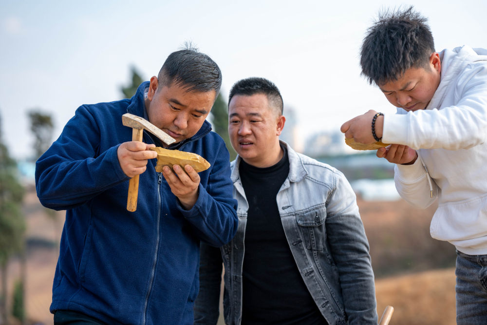 2024年2月22日,雲(yun) 南澄江化石地世界自然遺產(chan) 博物館副館長郭進(左一)和同事在雲(yun) 南省澄江市黑蟆地查看采集到的化石標本。