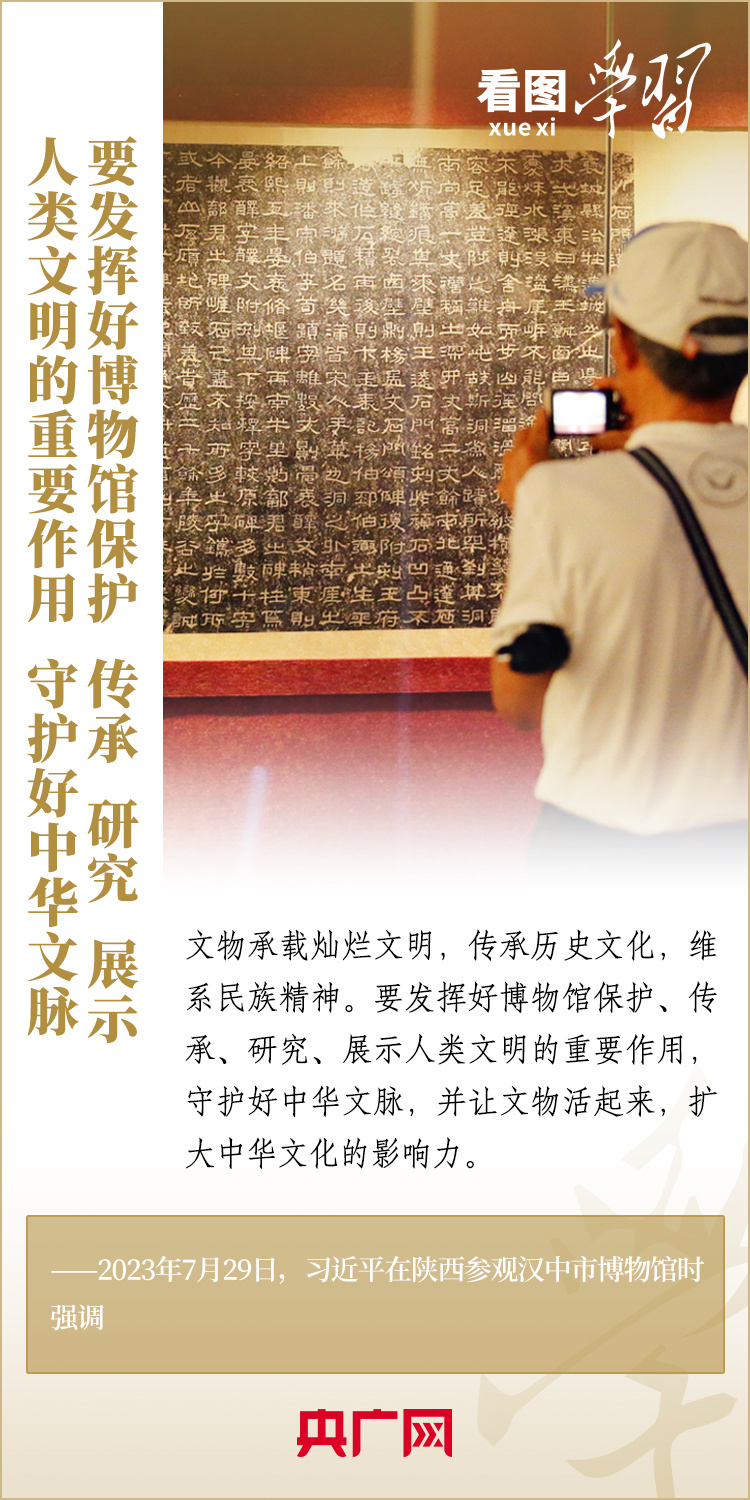 “一座博物館就是一所大學校”“博物館很重要,我從(cong) 小就愛看博物館,小時候北京的博物館我差不多都看過了”“博物館建設要更完善、更成體(ti) 係,同時發揮好博物館的教育功能”……在國內(nei) 考察中,習(xi) 近平總書(shu) 記曾經多次走進當地博物館,了解館藏文物的收藏、保護、研究情況,對博物館建設和利用作出重要指示。一起來學習(xi) !