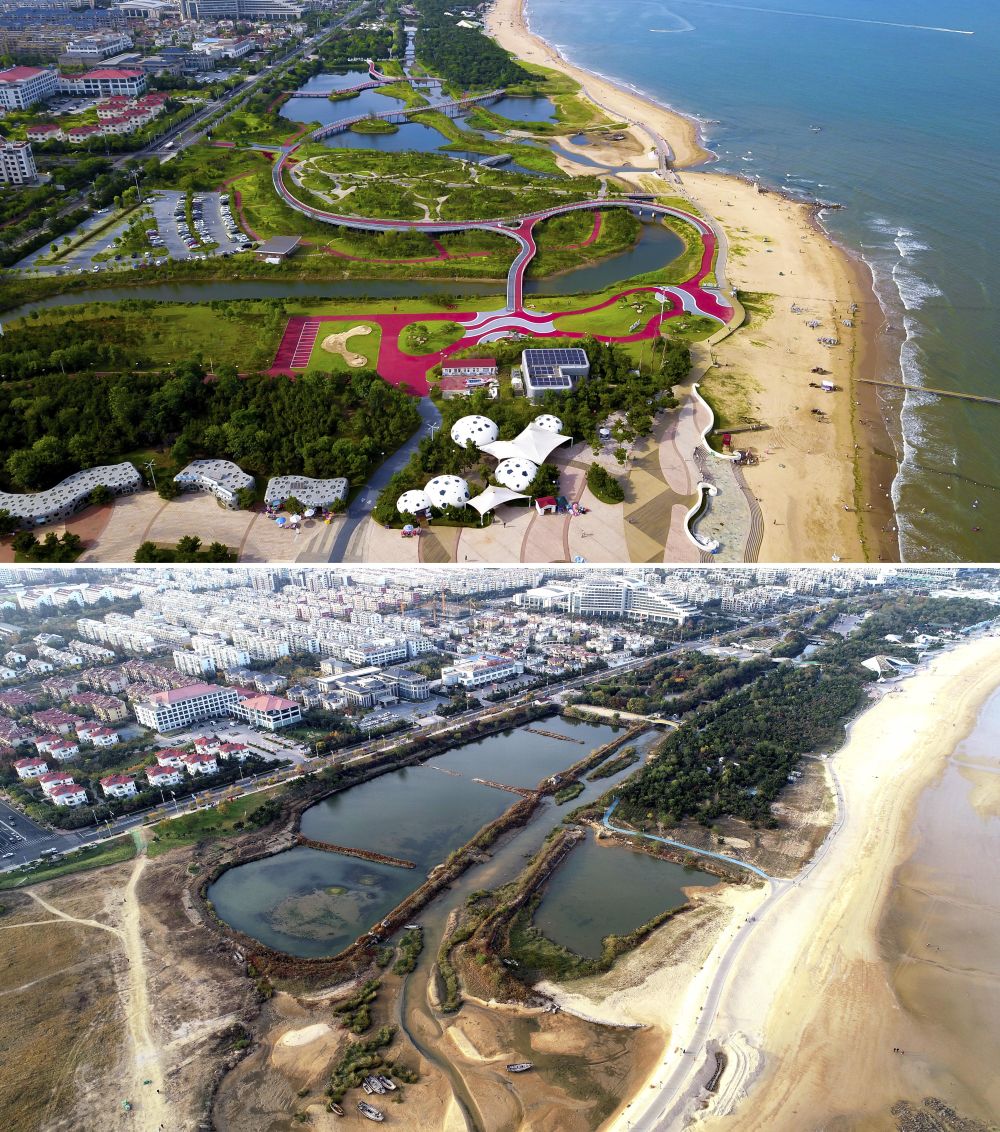 這是一張拚版照片,上圖為(wei) 2021年拍攝的生態修複完成後的山東(dong) 日照市陽光海岸綠道,該綠道長28公裏(無人機照片);下圖為(wei) 2019年11月拍攝的日照市陽光海岸綠道未經生態修複時的樣子。新華社記者 郭緒雷 攝