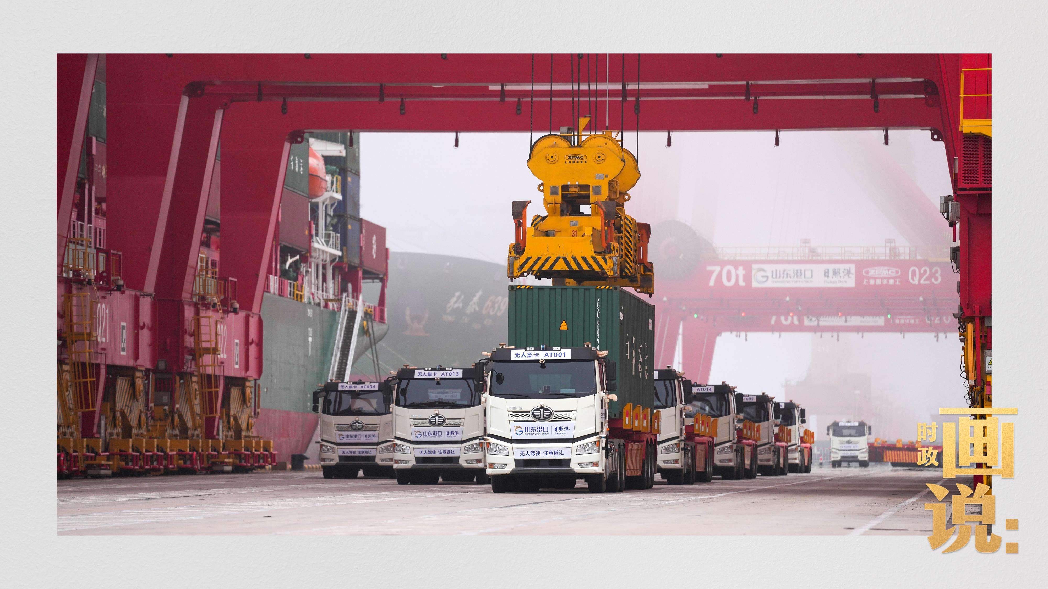 山東(dong) 港口集團日照港順岸開放式全自動化集裝箱碼頭,無人集卡車在運送集裝箱。