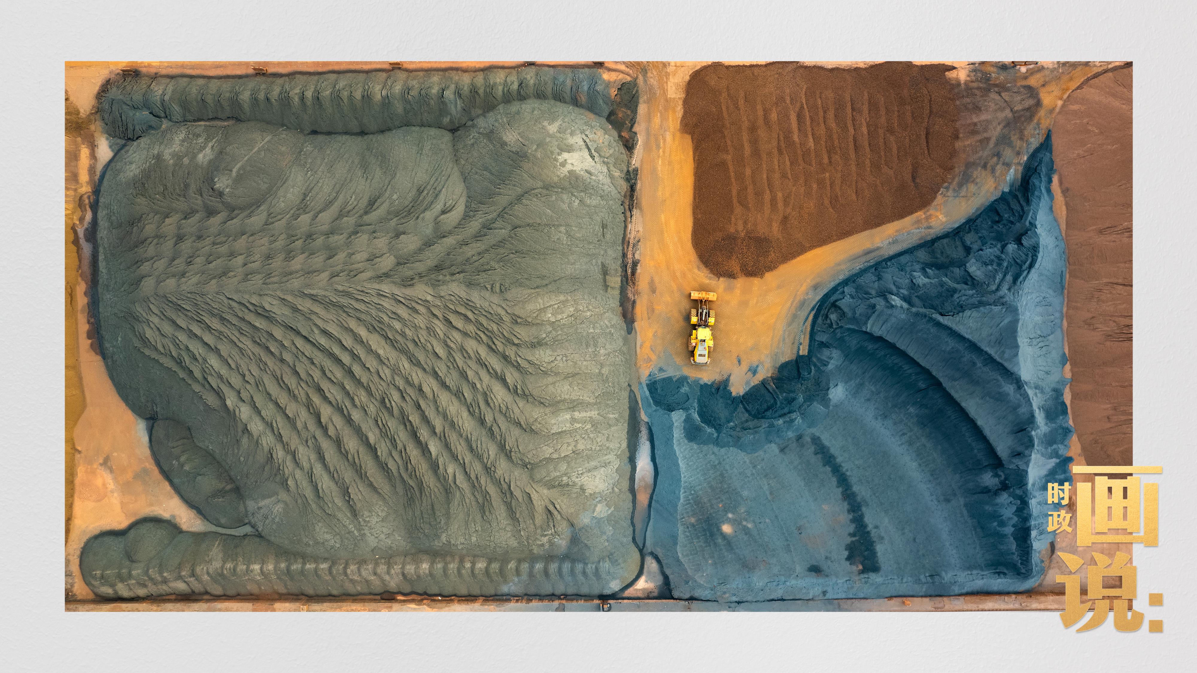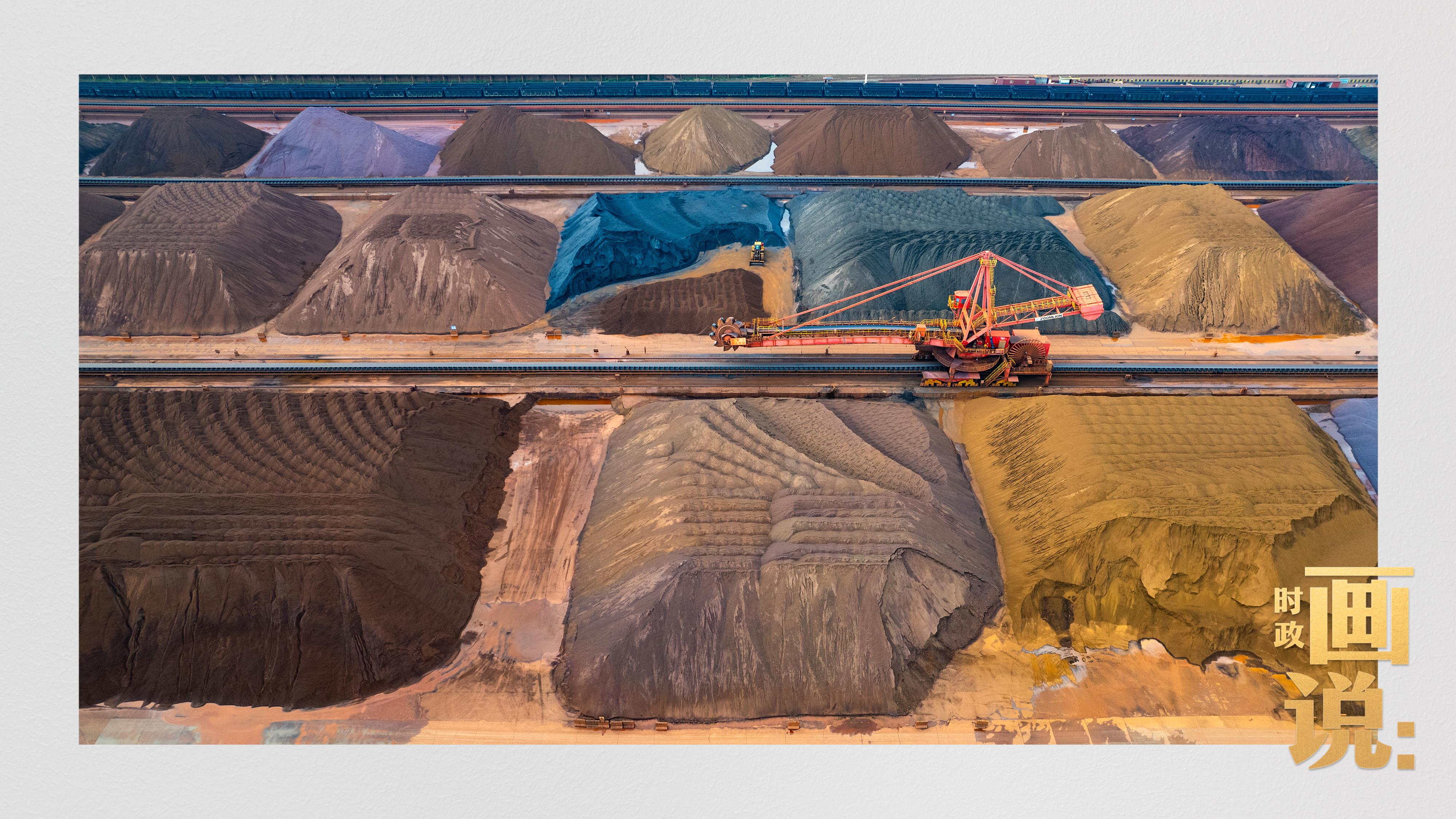 △港區內(nei) 的礦石堆場整理堆放著五顏六色的各類礦石、礦砂,宛如油畫。