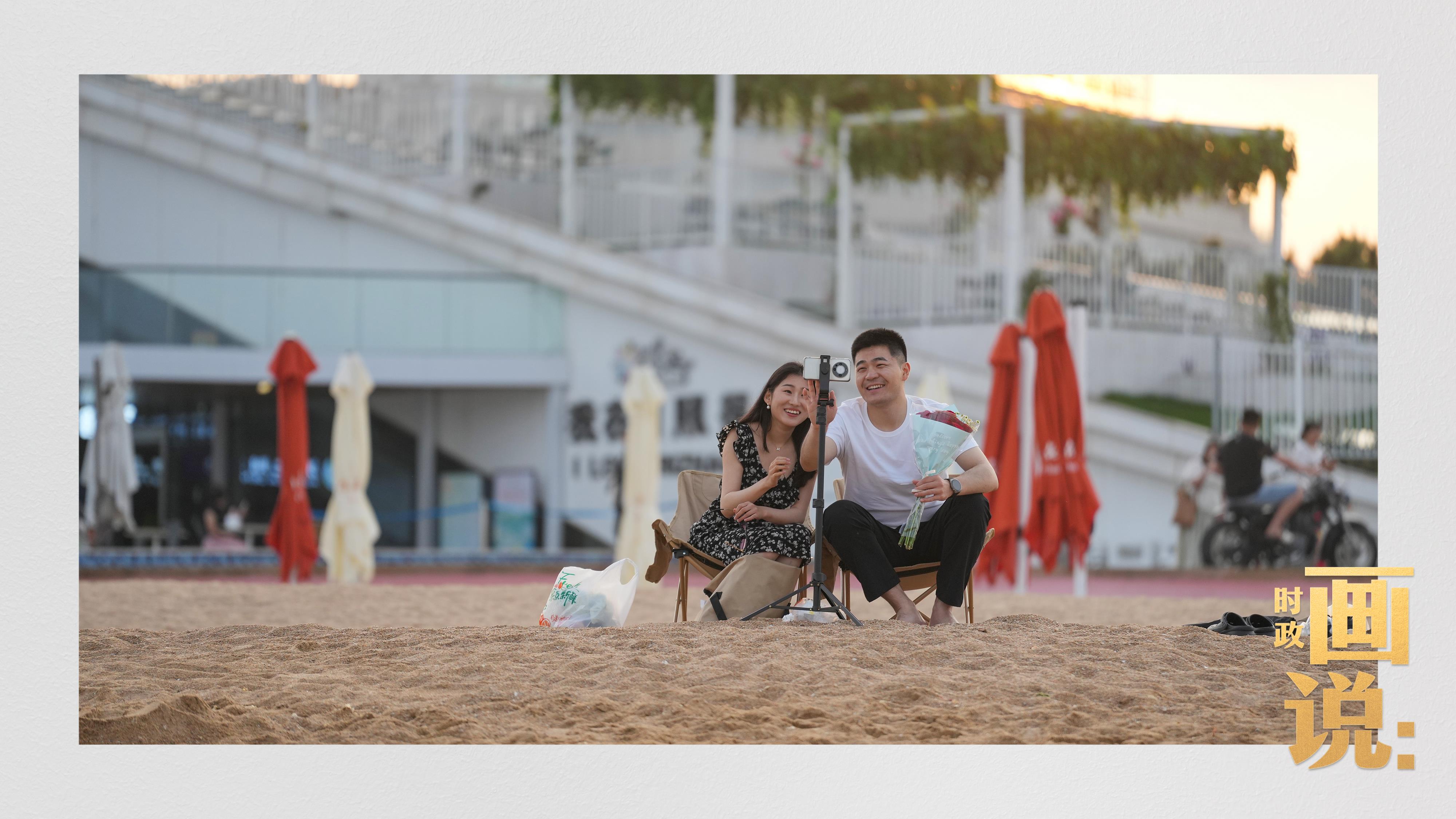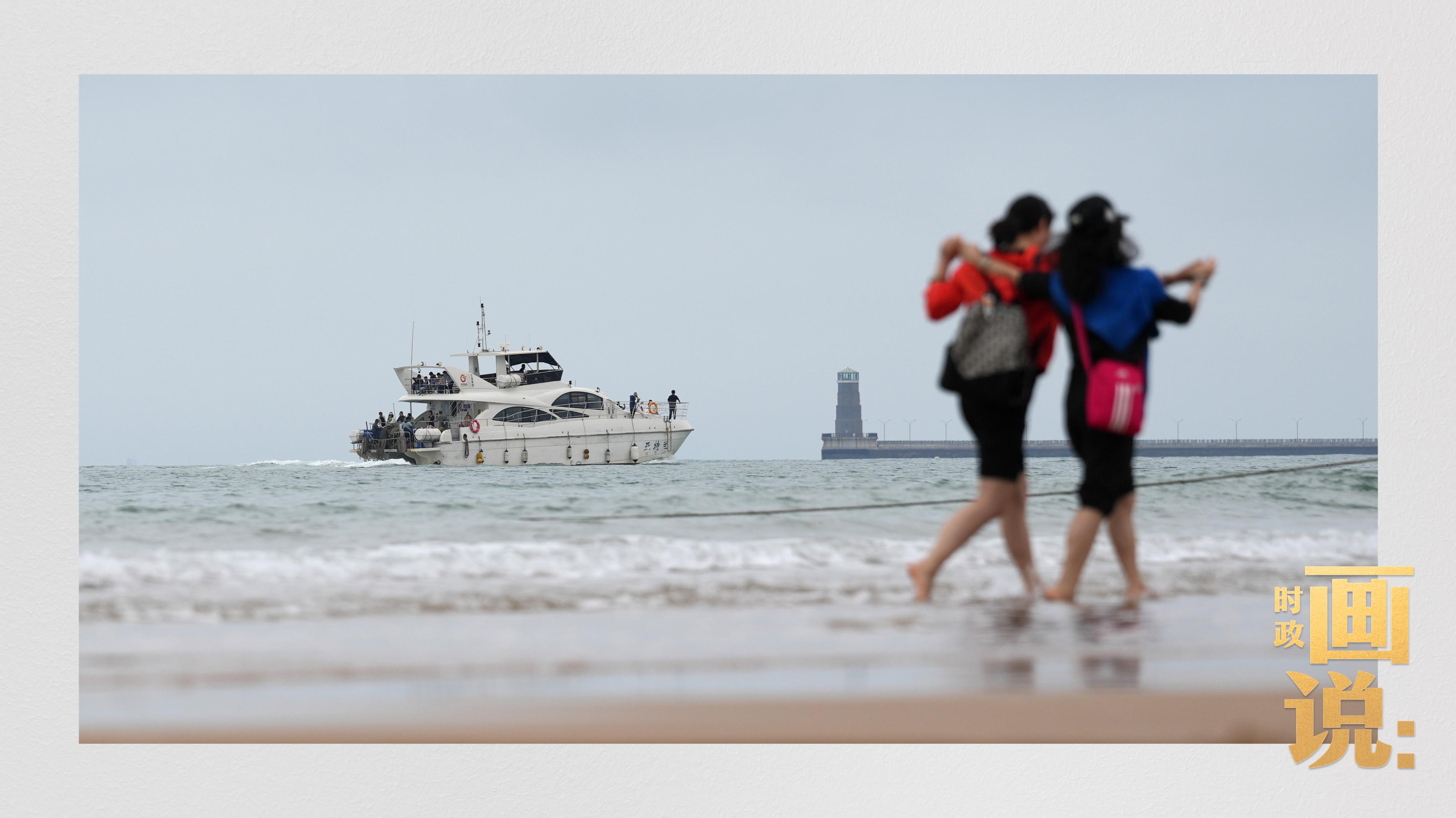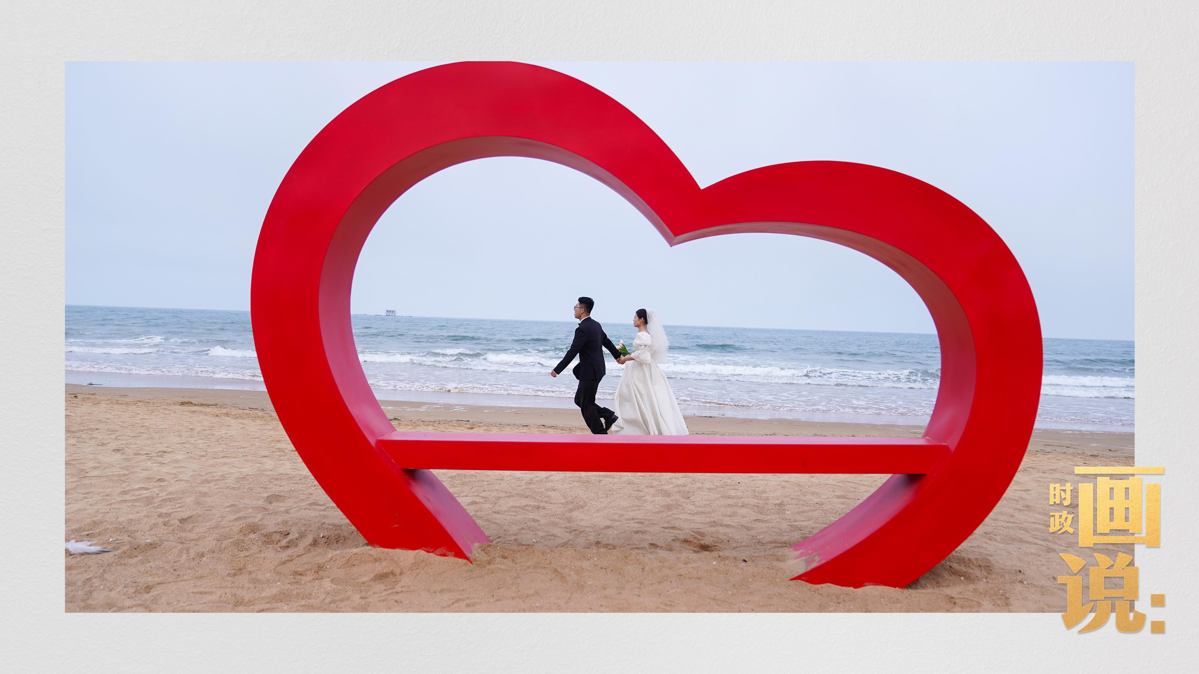 △日照陽光海岸綠道上的萬(wan) 平口景區,一對遊客在海浪中翩然起舞。