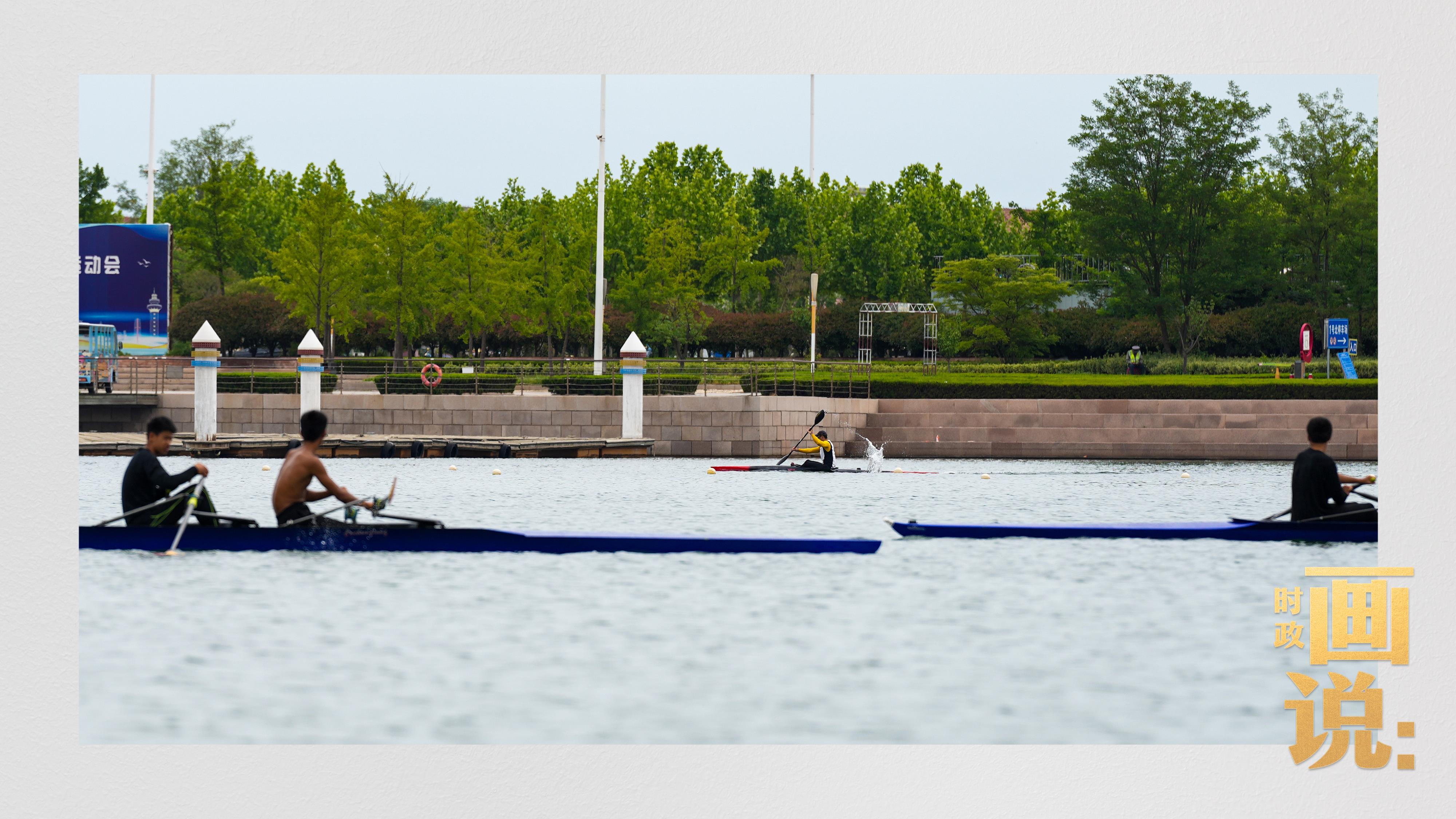 △奧林匹克水上公園碧波輕漾,皮劃艇運動員正在訓練。