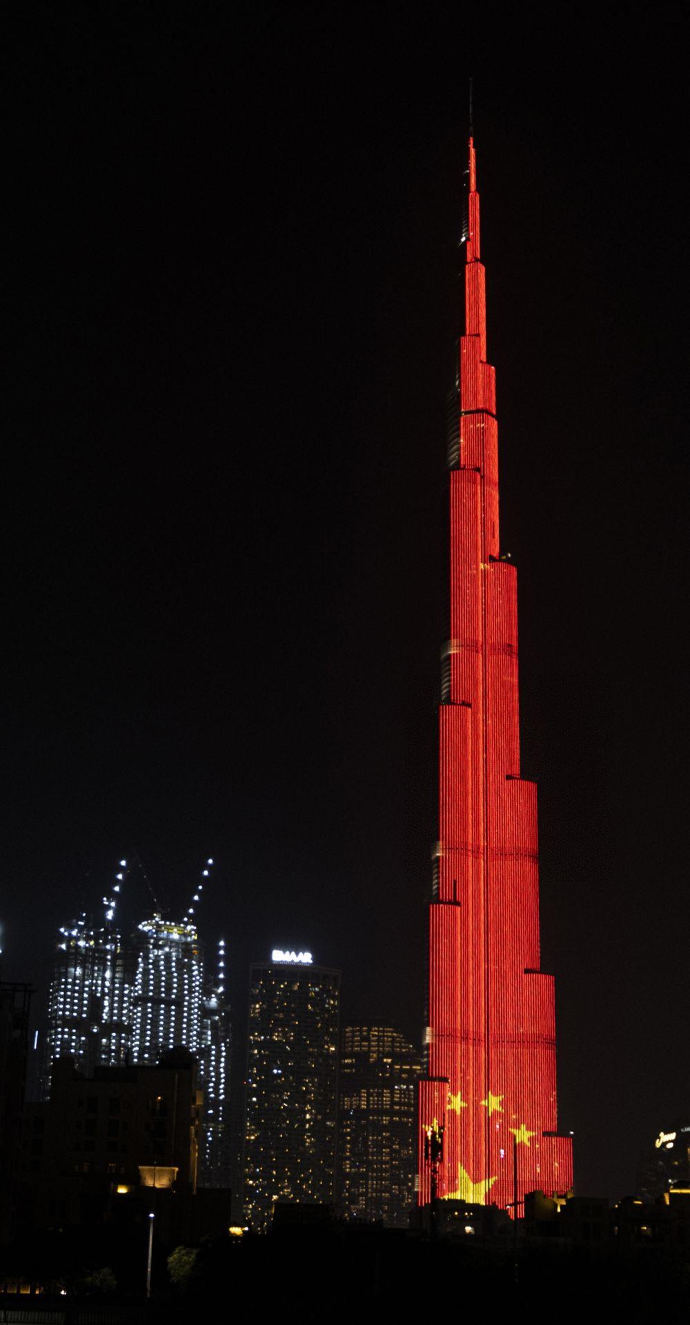 當地時間2020年2月2日,在阿聯酋迪拜,當地地標建築物哈利法塔點亮中國國旗圖案,為(wei) 中國抗擊新冠肺炎疫情加油。