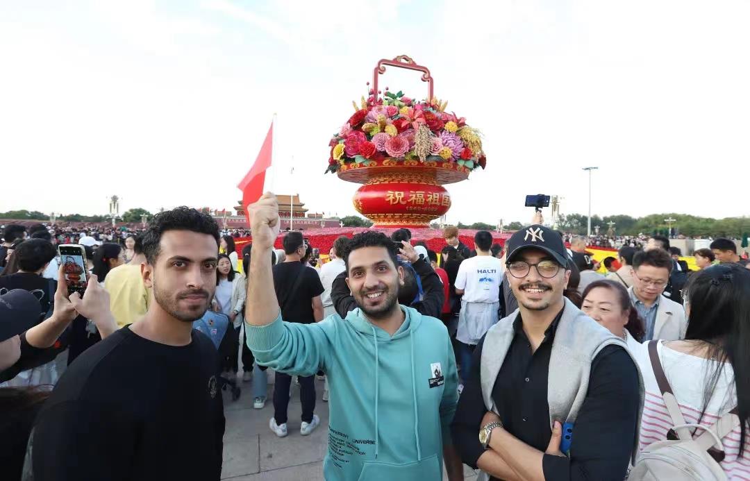 2023年10月1日,三位來自阿爾及利亞(ya) 的遊客在北京天安門廣場“祝福祖國”巨型花籃前留影。