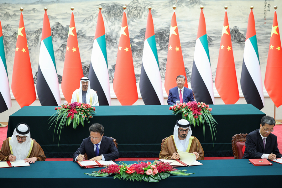 5月30日下午,國家主席習(xi) 近平在北京人民大會(hui) 堂同來華國事訪問並出席中國-阿拉伯國家合作論壇第十屆部長級會(hui) 議開幕式的阿聯酋總統穆罕默德舉(ju) 行會(hui) 談。這是會(hui) 談後,兩(liang) 國元首共同見證簽署多項雙邊合作文件。新華社記者 劉彬 攝