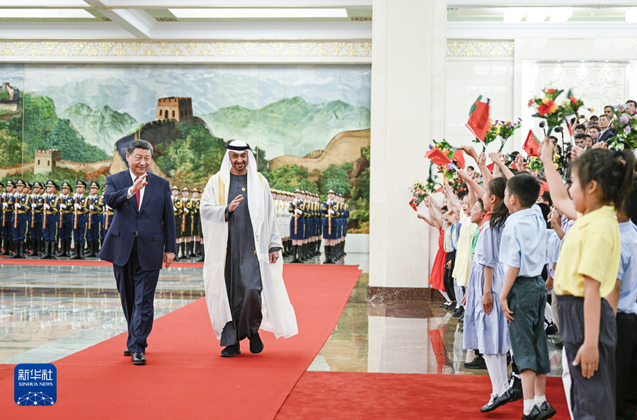 5月30日下午,國家主席習(xi) 近平在北京人民大會(hui) 堂同來華國事訪問並出席中國-阿拉伯國家合作論壇第十屆部長級會(hui) 議開幕式的阿聯酋總統穆罕默德舉(ju) 行會(hui) 談。這是會(hui) 談前,習(xi) 近平在人民大會(hui) 堂北大廳為(wei) 穆罕默德舉(ju) 行歡迎儀(yi) 式。新華社記者 饒愛民 攝