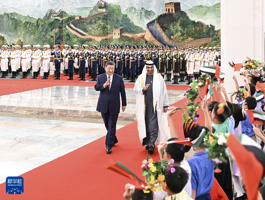 5月30日下午,國家主席習(xi) 近平在北京人民大會(hui) 堂同來華國事訪問並出席中國-阿拉伯國家合作論壇第十屆部長級會(hui) 議開幕式的阿聯酋總統穆罕默德舉(ju) 行會(hui) 談。這是會(hui) 談前,習(xi) 近平在人民大會(hui) 堂北大廳為(wei) 穆罕默德舉(ju) 行歡迎儀(yi) 式。新華社記者 申宏 攝
