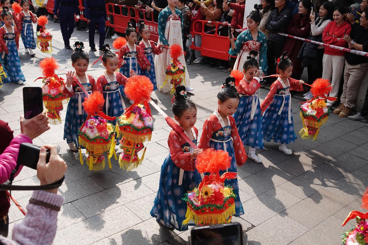 2024年3月4日,“潮州青龍廟會(hui) ”非遺巡遊舉(ju) 行。圖為(wei) 幼兒(er) 園小朋友身穿漢服在昌黎路巡遊。