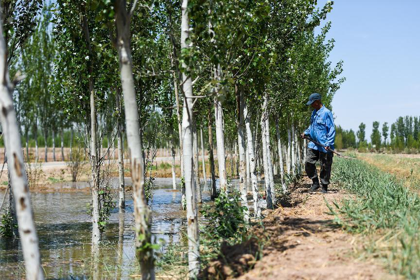工人在內(nei) 蒙古巴彥淖爾臨(lin) 河區國營新華林場管護樹木(2024年5月26日攝)。數十年來,林場結合“三北”防護林、京津風沙源治理、低質低效林改造等生態工程,持續提高森林覆蓋率。