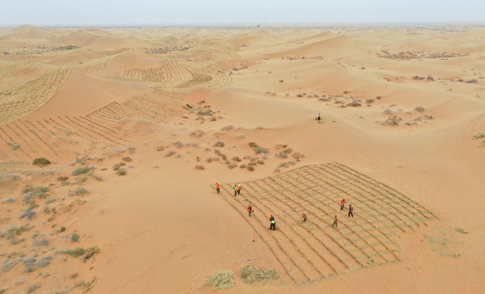 2024年4月27日,治沙工人在內(nei) 蒙古阿拉善左旗騰格裏沙漠S315沿線固沙工程現場用稻草紮草方格(無人機照片)。