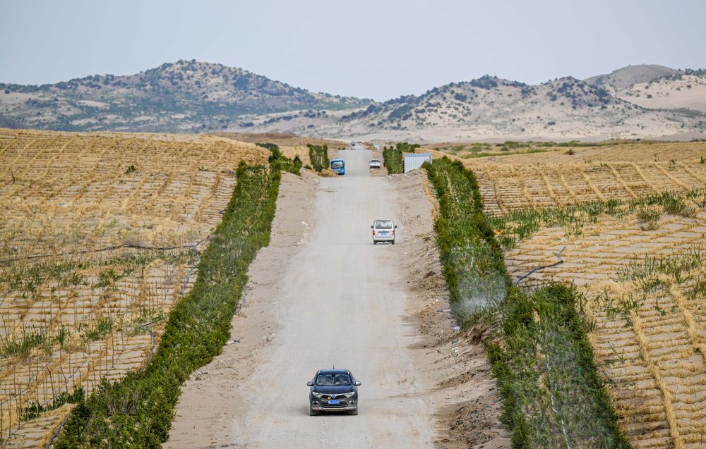 在內(nei) 蒙古赤峰市翁牛特旗巴彥呼交嘎查其白線防沙治沙項目區,穿沙公路將沙地切割,沙丘被逐步固定(2024年5月16日攝,無人機照片)。